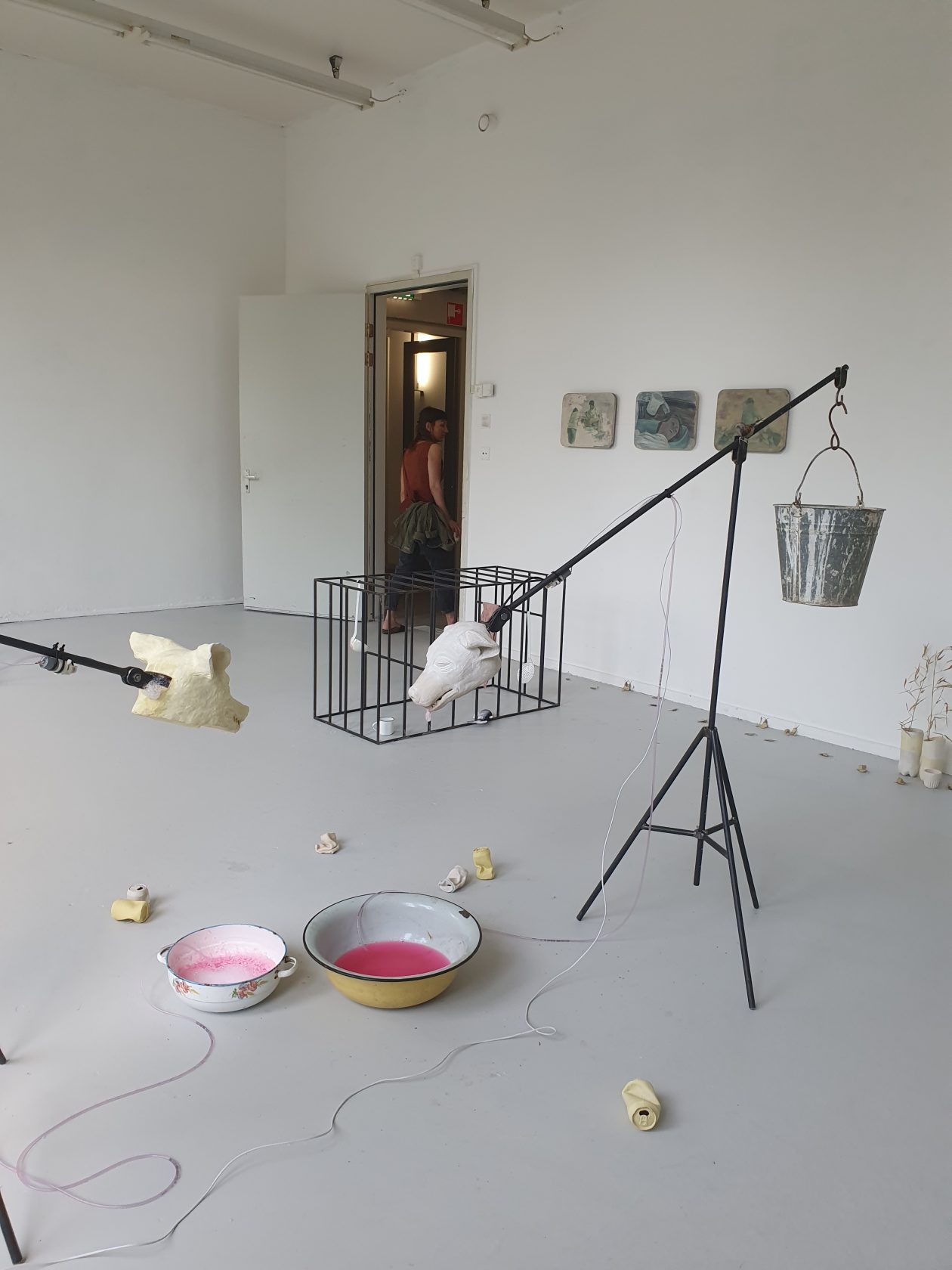 Tijdens mijn bezoek aan de Rijksakademie ’21, vele jaren na het schrijven van beiden heren, ontmoet ik het werk van de Peruaanse kunstenaar Arto Kameya (Lima, 1984). Het werk oogt in de eerste plaats onschuldig. Als een verliefde verliefde, zoemend in het rond, lijkt de wereld hier zacht en doezelig. In pasteltinten – geel, roze en lichtblauw – zijn porseleinen beelden, vazen met bloemen, emmers met vloeistof en schilderijen van acryl als harmonische eenheid gecompileerd. Alsof er een vale waas over de wereld hangt, je door een filter om je heen kijkt. Kameya’s werk kan geassocieerd worden met de toestand van een deken, een lichtblauwe lucht of lentedag, of, zo duidt het Parool (2021) scherp, als de verbleking van tijd: ‘alsof de zon er [op zijn schilderijen] veertig jaar op heeft geschenen’.