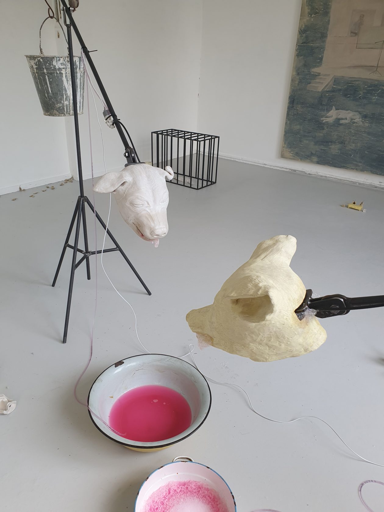 Tijd en plek voorbij te zijn, als een reflectie op een cultuur die was en de basis vormt voor dat wat is, maar dan anders. Verliefdheid wordt liefde, leven wordt dood, en ik kijk naar de aan stokken gespiesde varkenskoppen boven gele emmers met rozerode sap (bloed?). Voor Kameya als een viering van zijn eigen roots in Lima te midden van de drukte in Amsterdam, om daar als bakens van een plek en tijd een nieuwe realiteit te bouwen. “To what extent does this context [museum, red.] distort our image of (historical) reality?”, zo vraagt de kunstenaar zichzelf al eerder af.