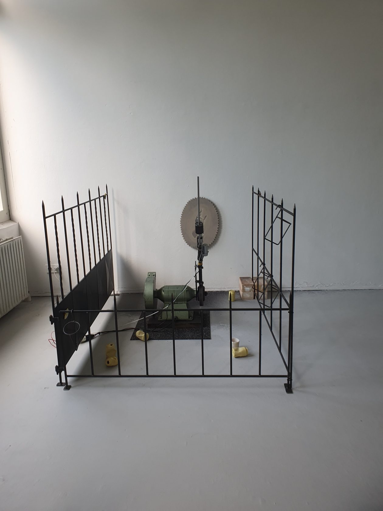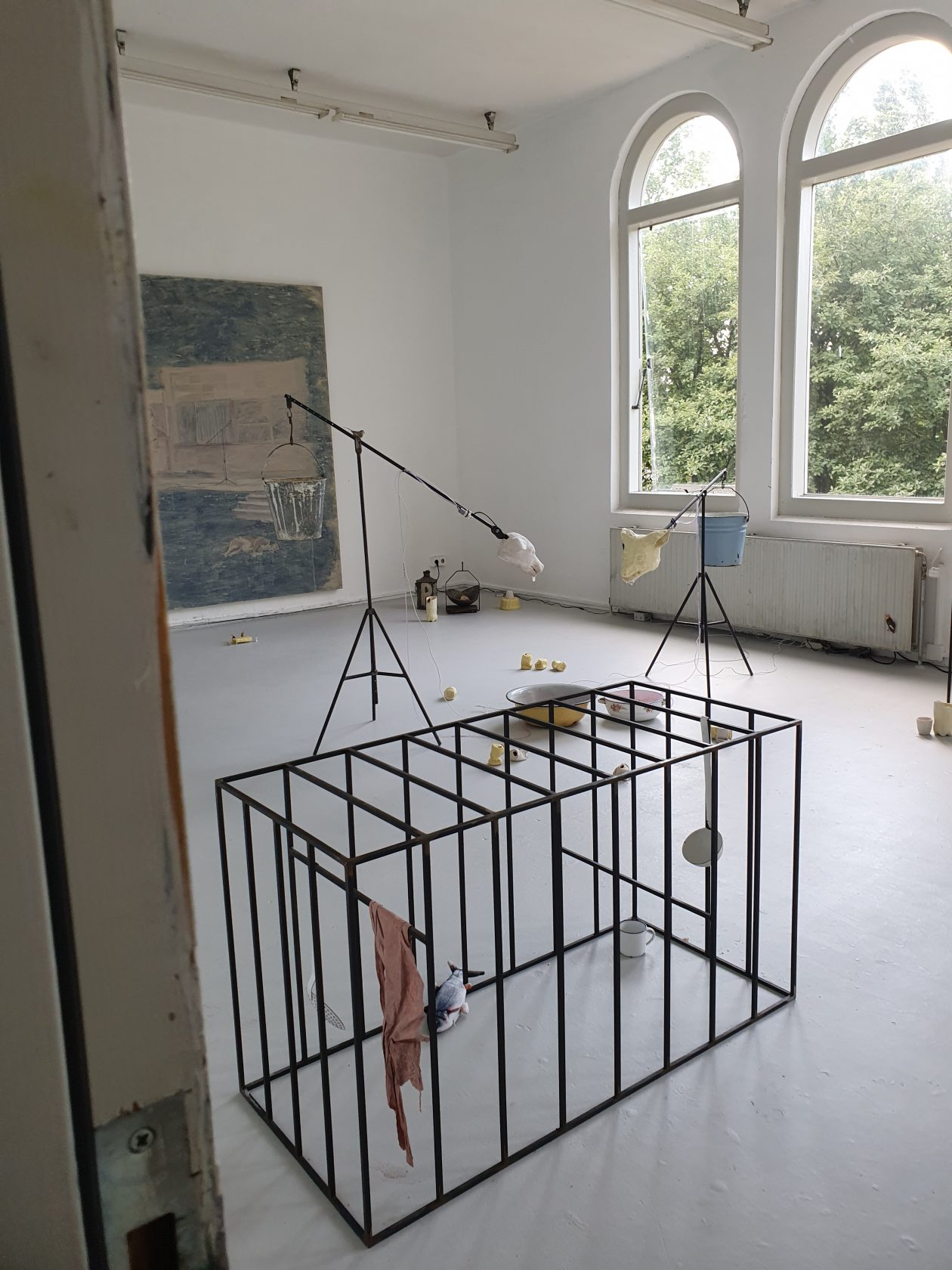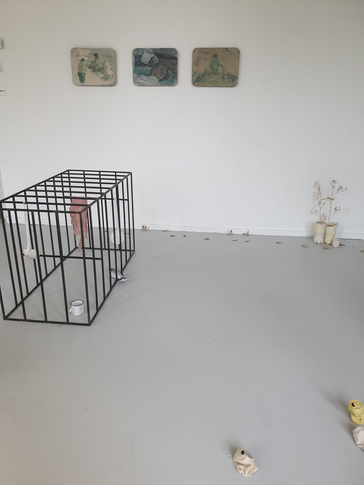 Achter mijn eerste aanblik – pastel, droom, sprookje, denkbeeld – schuilen lagen die je meevoeren in een narratief dat, op een tweede oogopslag, ergens ook laat gruwelen. De imaginaire realiteit van Barthes verliefden, een ingebeelde wereld door een roze bril, maakt plaats wanneer die roes doorbreekt. Een duiding van een toestand die zich met het werk van Kameya laat vergelijken. Het werk van Kameya roept geen verliefdheid op. In plaats daarvoor verleidt het je, te midden van een doezelig decor, onder een schaduwdeken. In een stalen kooi van een halve meter hoog spartelen rubbervissen. Onder de zachte mantel van het deken wordt het leven langzaam gedoofd. Een vis op het droge, omhuld door een kooi, schilderijen over zorg, en koeienkoppen aan een spit. Het zijn herinneringen aan Kameya’s jeugd in Lima die ik als toeschouwer slechts interpreteer.