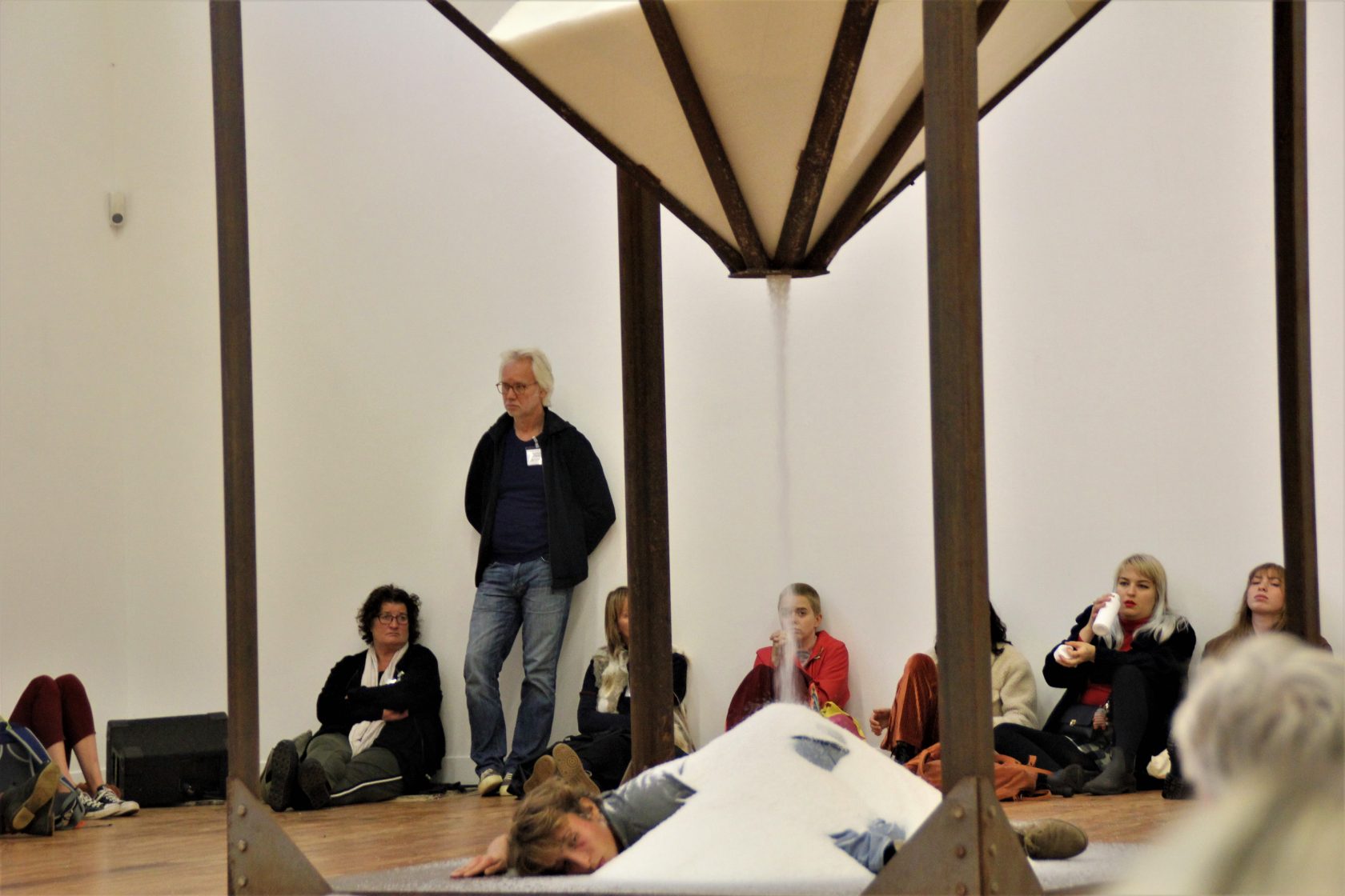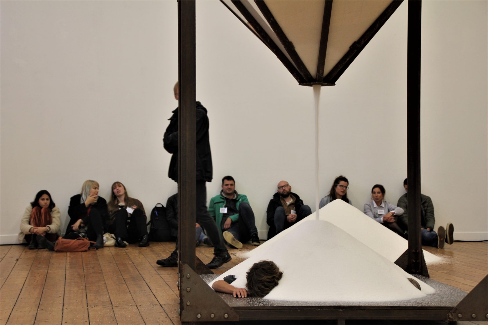Ik had weg willen kijken en misschien ook weg willen gaan, maar was gebleven. Ik was blijven staan, bleef kijken, verbouwereerd door de intensiteit voor me, terwijl er maar weinig veranderde. Seconde na seconde werd het beeld echter langzaam zwaarder, als een mantel die zich over je schouders heen laat zakken zonder dat je dat per se wilt. En iets zei: ‘stop’. Heel hard, STOP! Iets in mij wilde de performer, Francesca Lazzeri, onder een steeds hogere berg zout vandaan trekken. Wilde haar de lucht in duwen, de confrontatie verbreken. De ademnood stillen, het leven laten. Maar iedereen, iedereen, ook ik, keek. En we waren doodstil.
