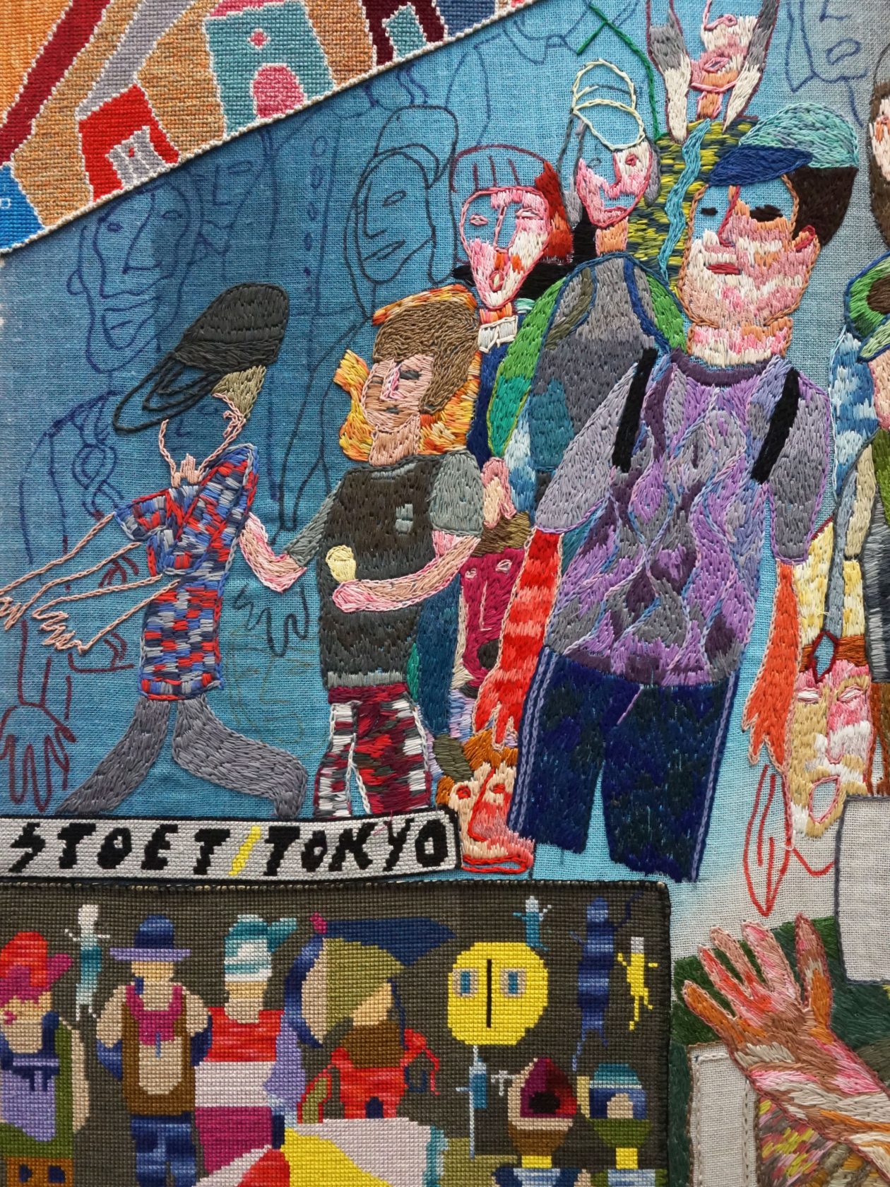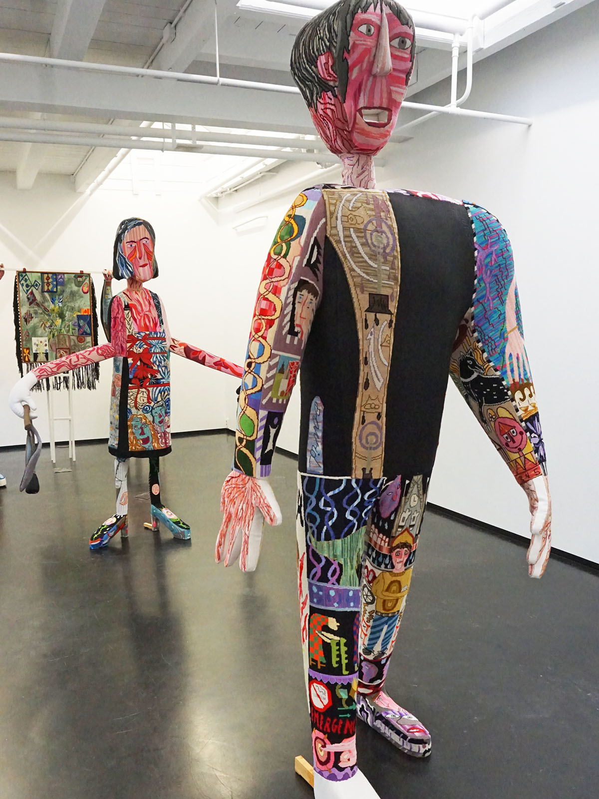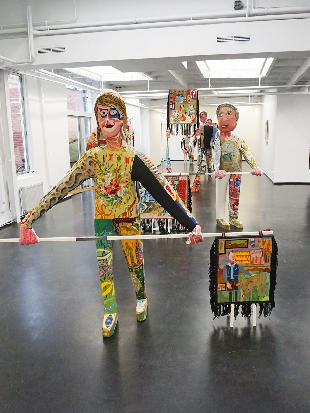Familie, vrienden, kennissen. Wat is het toch een gezellige boel om ons heen. We omringen ons met een kleurrijke verzameling van mensen die we graag mogen, verdragen, bewonderen, liefhebben en verfoeien. Dat bonte geheel vertaalt zich bij Rommelaere in kleurrijke beelden. In tweedimensionale vorm zijn het herinneringen, fantasieën en waarnemingen genoteerd in kruissteken op een gaasdoek. In driedimensionale vorm worden het meer dan levensgrote poppen die samen een parade vormen van figuren die deze Vlaamse kunstenaar continue met zich mee draagt. Rommelaere heeft van zijn vrienden en familie zijn werk gemaakt. Opdat niet alleen hijzelf maar ook wij nooit meer zullen vergeten wie er tot zijn intimi behoren. Zijn eigen kleine sociale kring krijgt daarmee een monumentale status. Het is alsof Rommelaere alvast bezig is om zijn eigen uitvaart te organiseren. En wij mogen er bij zijn.
