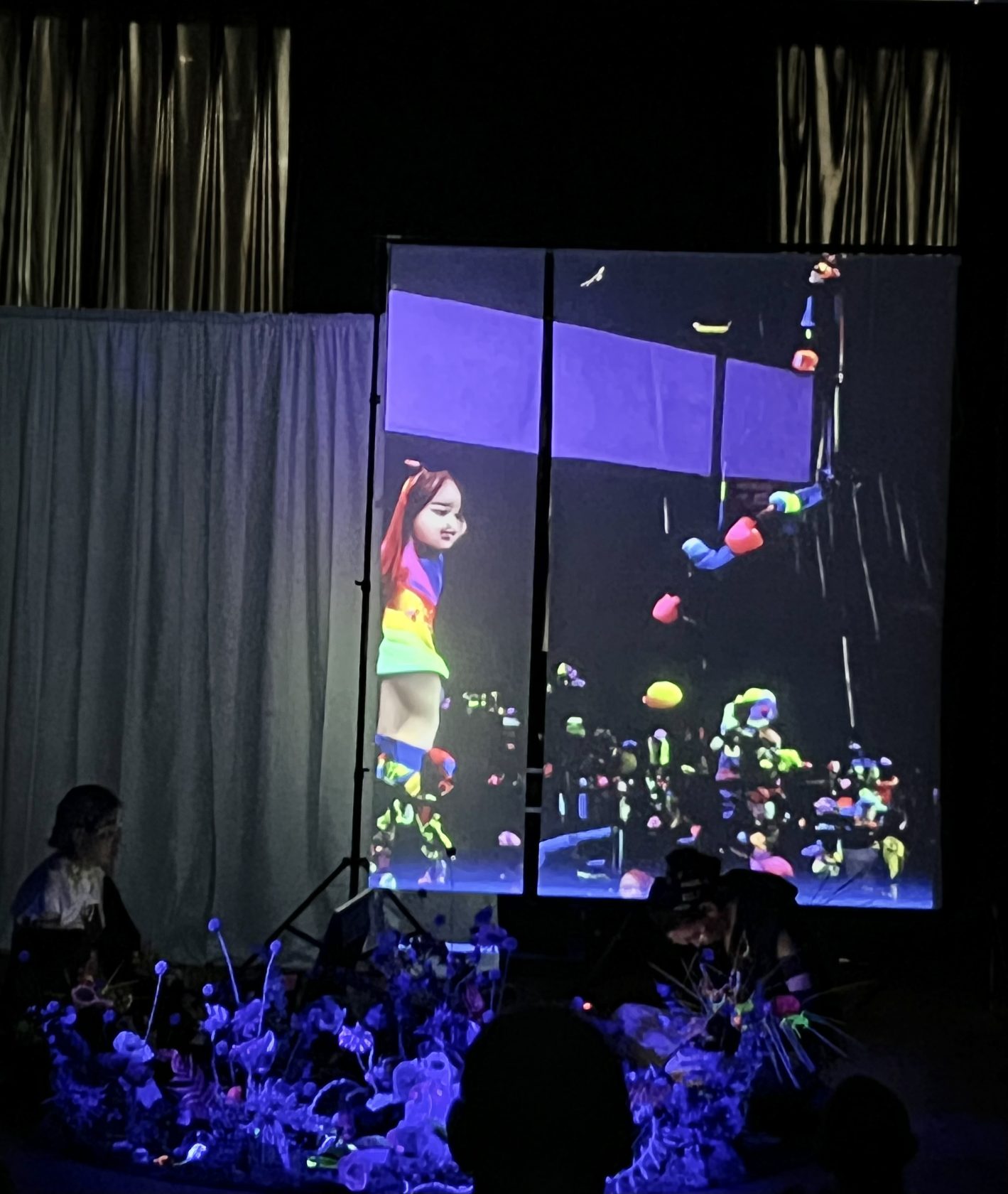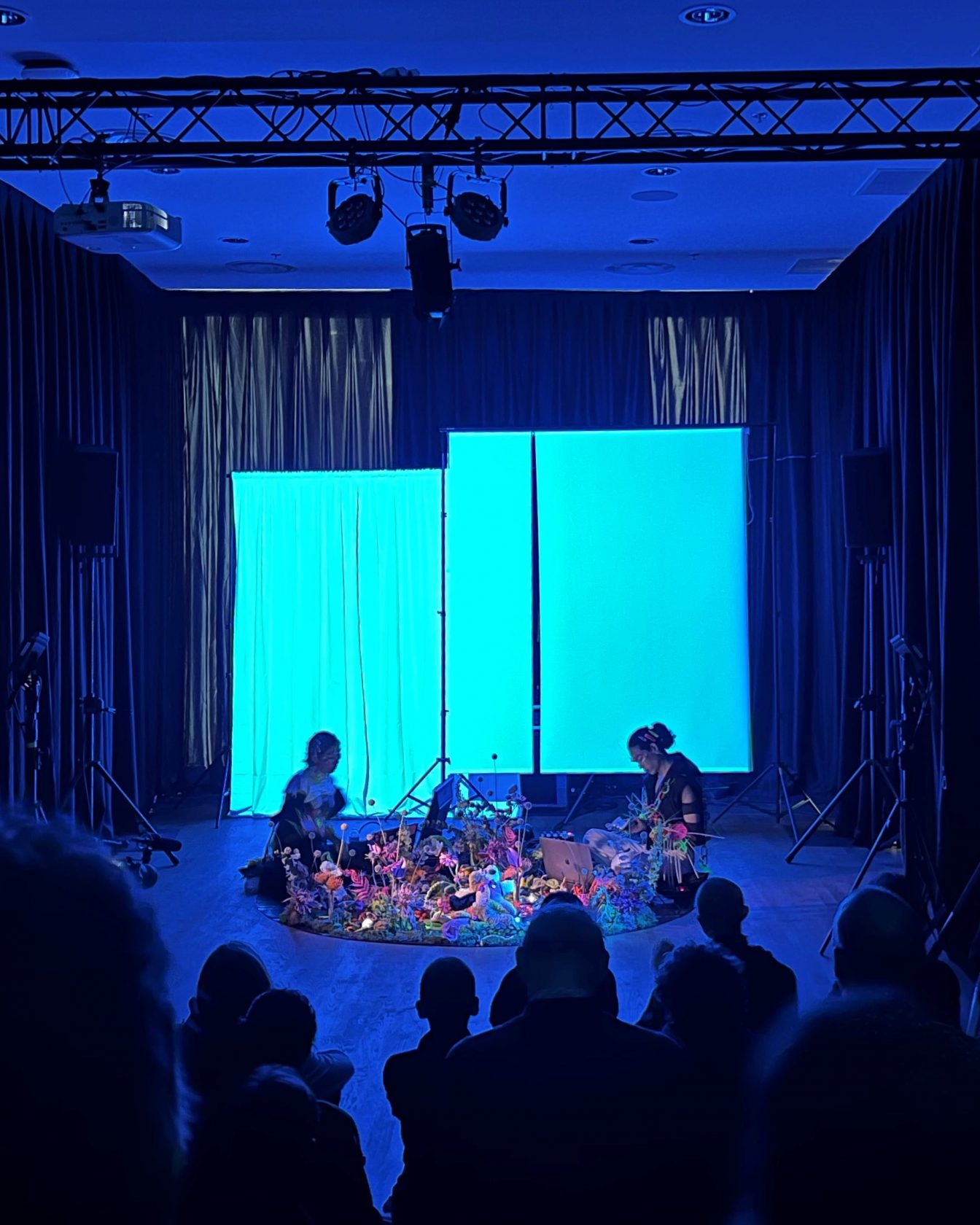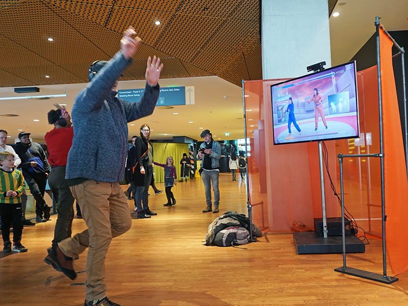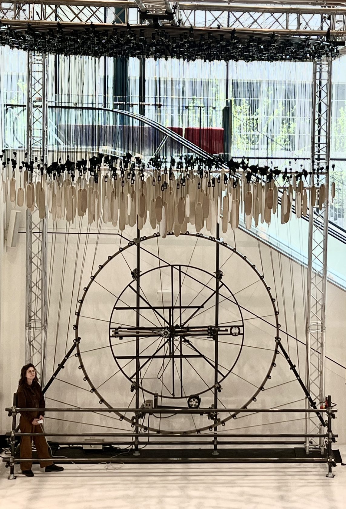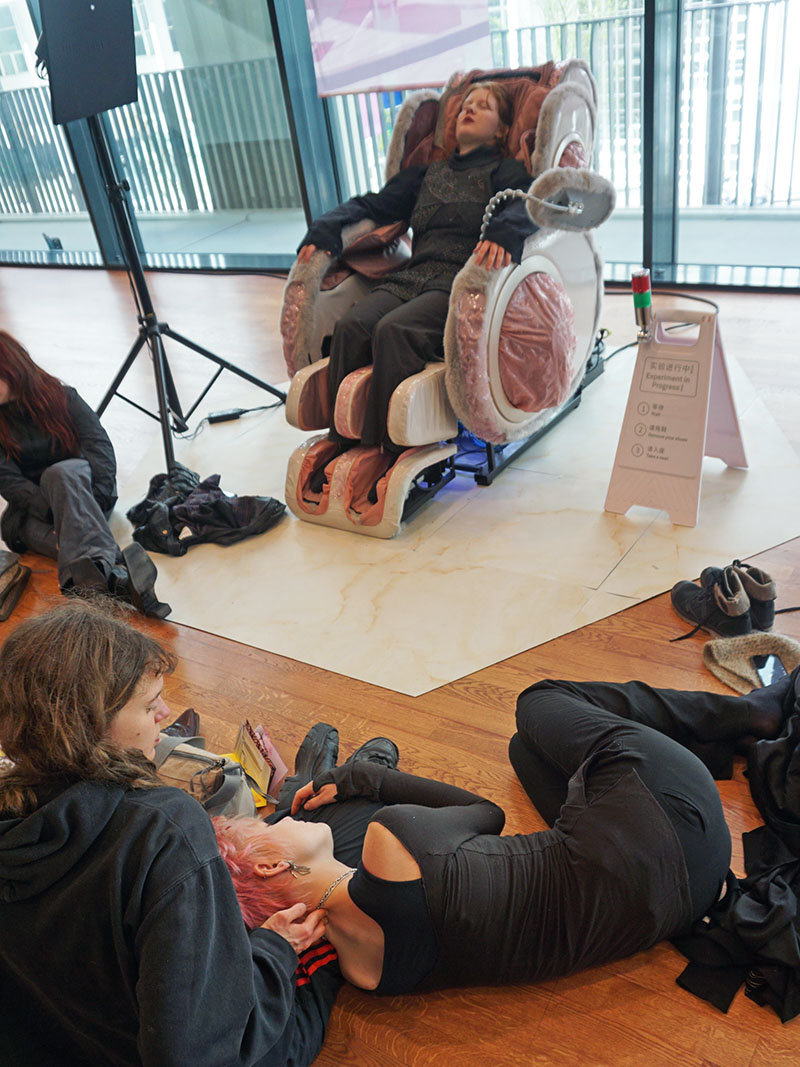 Ook de installaties en performances verkeren in elkaars invloedsfeer en komen daardoor niet altijd tot hun recht. En soms kun je je afvragen waar de kunst te vinden is. De trilbanken van Jesus Canuto Iglesias hebben eerder een mooie uitwerking gehad op meer duistere locaties en staan nu in een saunaopstelling tussen plastic kantoorplanten. De tril-en geluidservaring wordt overstemd door de aerobic-les van Kexin Hao even verderop. De entourage roept onmiddellijk het gevoel op van een ‘open huis’ of uitmarkt. En het is lastig om tot bezinning te komen wanneer we vanaf een tribune naar het mechanische klokkenspel van Gemma Luz Bosch & Jurriaan de Vos kijken terwijl er mensen door het beeld lopen, op weg naar een andere bestemming in het gebouw. Voor de relaxfauteuil van Arvid & Marie ligt meisje in de schoot van een ander meisje, en we vragen ons af of zij niet veel beter tot ontspanning komt dan het meisje dat de stoel ondergaat. In hoeverre zijn technische oplossingen in staat menselijk contact te vervangen?