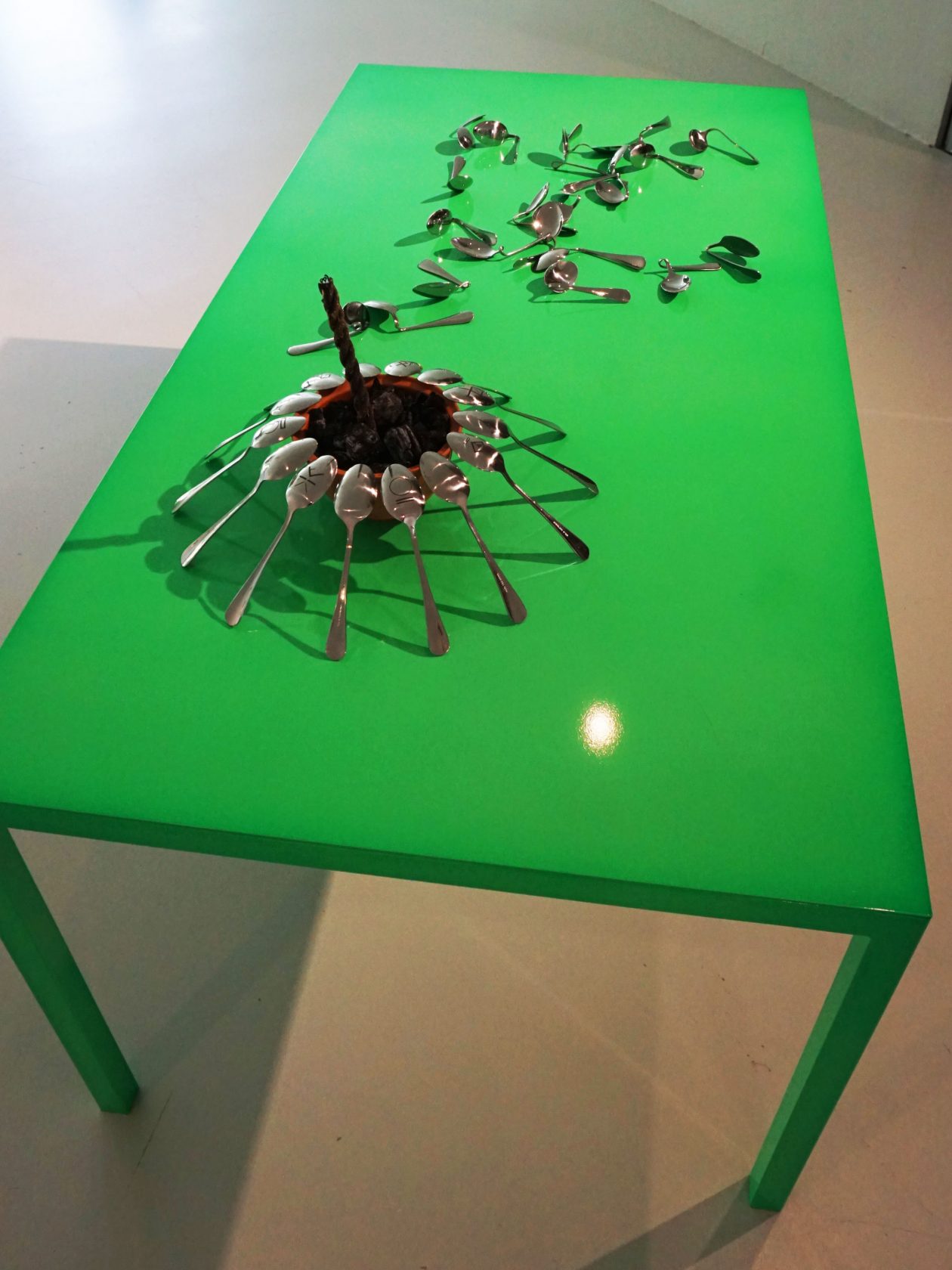 De spiegelpuzzels van Alexander Adamov of de kledingsculptuur van Ala Savashevich spreken voor zich, maar de groene gedekte tafelinstallatie van Masha Maroz blijft zelfs na het lezen van de begeleidende tekst een mysterieus werk dat verwijst naar rituelen waarvan we de spelregels wellicht nooit zullen begrijpen. Maar wellicht is dat ook een portret van de binnenwereld van Belarus.