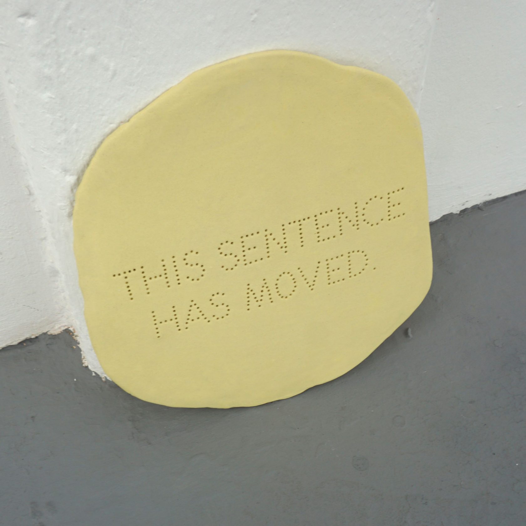 De teksten van het vouwblad bewaar ik voor later, wanneer het terugdenken aan het werk eventueel vragen zal oproepen die beantwoord willen worden. Ik beperkt me nu tot de woorden die daadwerkelijk onderdeel zijn van de tentoonstelling en die grotendeels aansporen tot het gebruik van de zintuigen. Maar ook die woorden heb ik eigenlijk niet nodig om deze werken te kunnen bekijken. Ik bekijk de letters die woorden vormen, maar eigenlijk niet meer zijn dan een verzameling stippen. Ik onderzoek de medailles aan de muur, de fotobeelden op de vloer en de vormen van de cakes zonder te willen weten waarvoor zij dienen. Ik vraag me tenslotte ook niet af waarom ik zelf besta. Ik ben slechts de spons die hier min of meer toevallig terecht is gekomen.