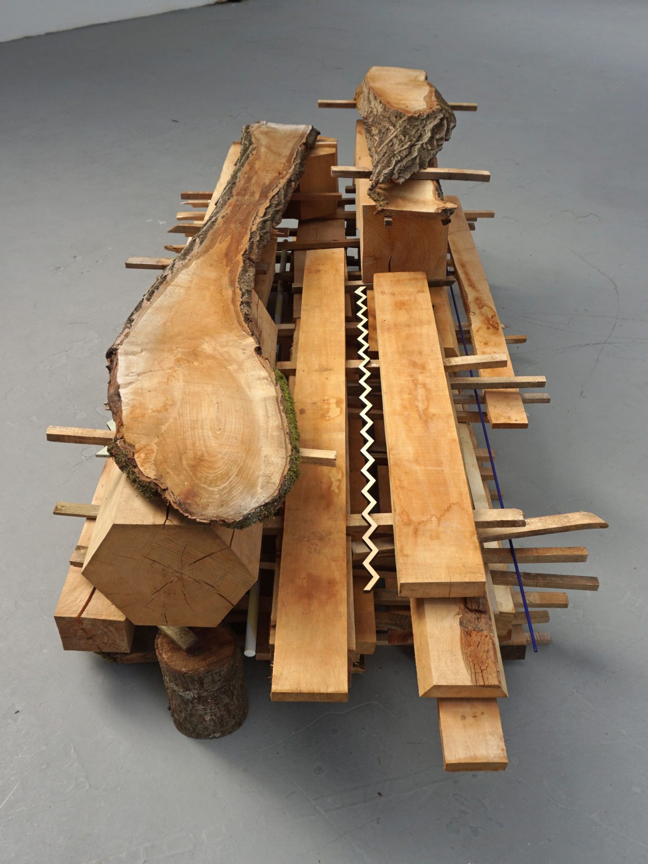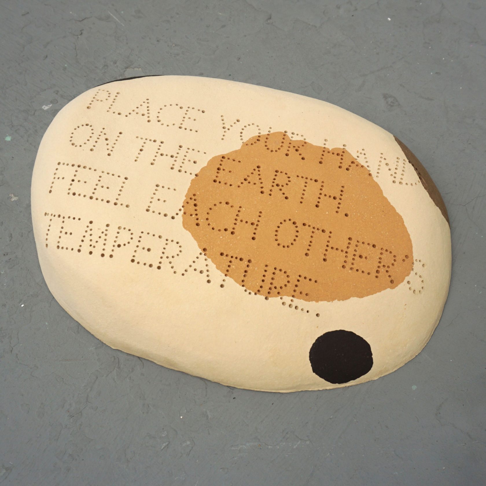 Die ‘druppels’ bestaan ook weer uit allerlei verschillende materialen. Soms zijn het stenen, keramisch uit klei gevormd. Dan weer zijn het medailles van vilt, proppen papier of sponscakes. Ze zijn nooit alleen. Altijd in de nabijheid van andere druppels. Soms liggen ze op een denkbeeldige lijn of vormen ze een groep maar altijd zijn ze op de een of andere manier visueel met elkaar verbonden. Deze losse elementen verwijzen zowel naar de natuur als naar menselijk handelen. Er zijn zoveel onderlinge verbindingen te leggen dat ze samen een wereld vormen die vreedzaam verder kan leven. Het is een tolerante wereld waarin geen van de deelnemers een bedreiging lijkt te vormen voor een andere entiteit.