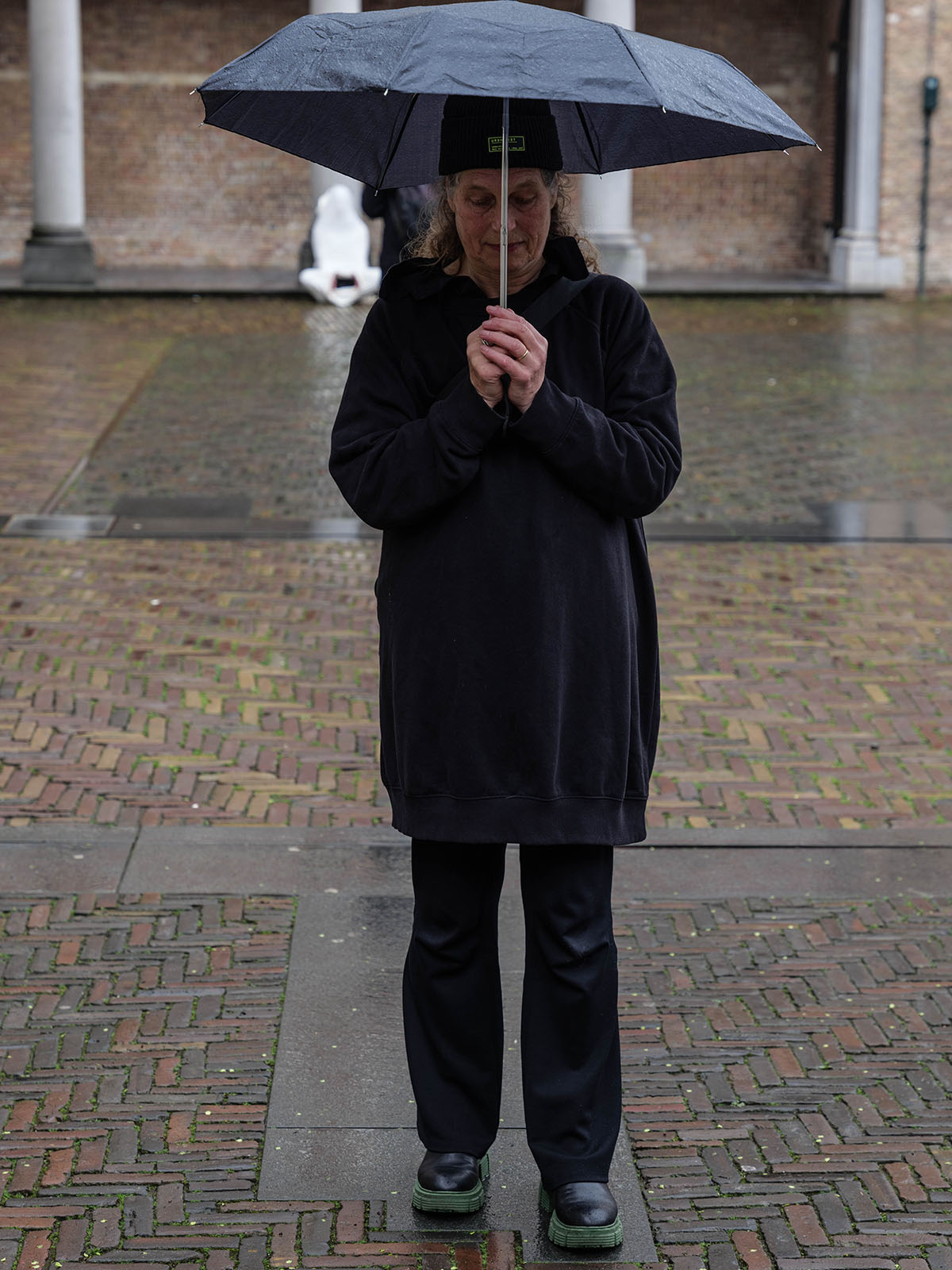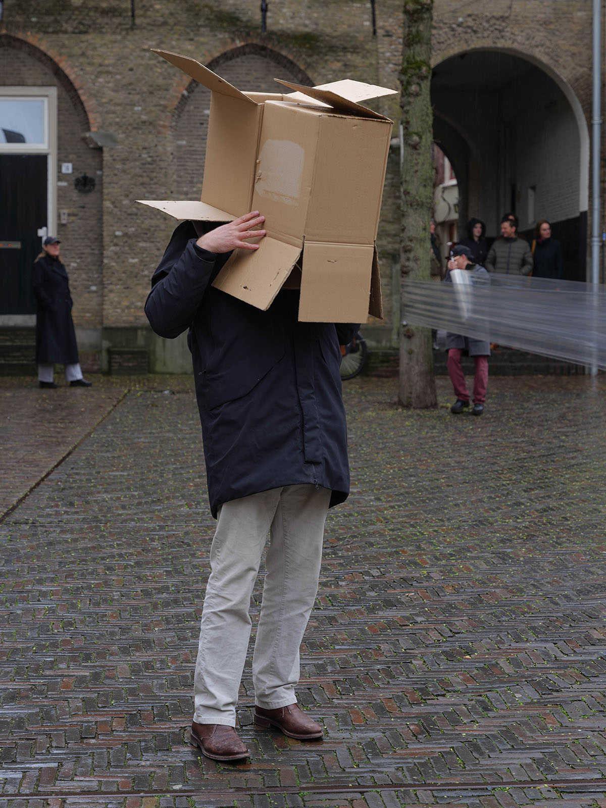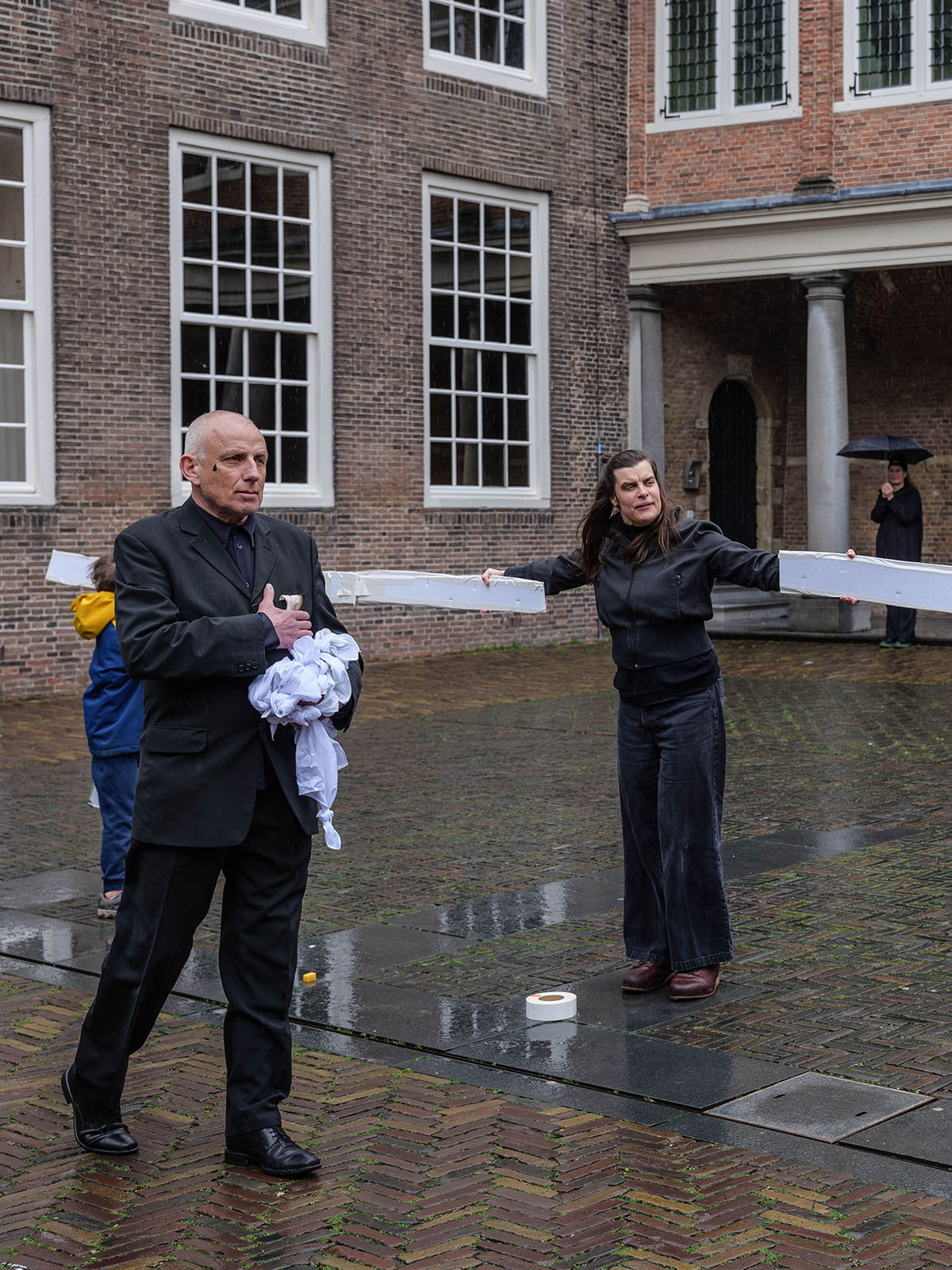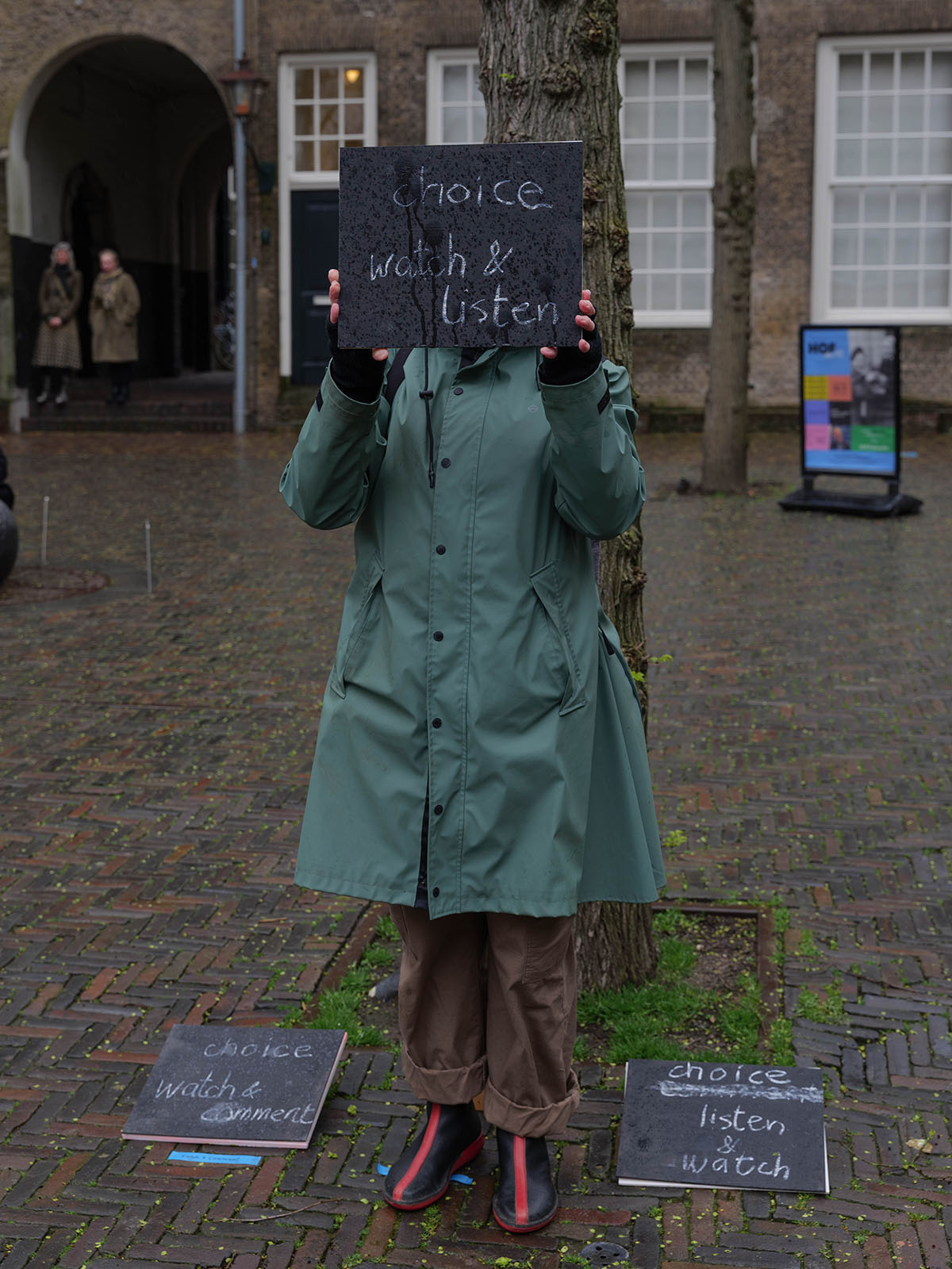Het publiek bestaat enerzijds uit individuen die vrijwillig op het evenement zijn afgekomen en anderzijds uit toevallige passanten, die het plein schoorvoetend of resoluut doorkruizen om aan de andere zijde terecht te komen. Langzaam begint het steeds harder te regenen, maar de meeste kunstenaars geven geen krimp en zetten hun uitvoering onverstoorbaar door. Deelnemend kunstenaar Gerwin Luijendijk loopt rond met een telefoon waarmee hij een live video verbinding met zijn ouders onderhoudt. Zijn ouders reageren op de beelden met live commentaar. De meeste kunstenaars gaan op in hun eigen werk en hebben geen idee wat de andere performers aan het doen zijn. Alleen de gemaakte documentatie kan deze lacune opvullen.