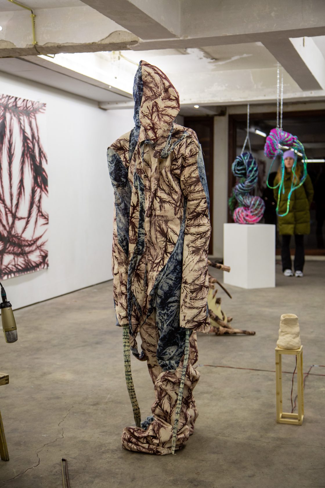 Werk gemaakt van touw, textiel en cellofaan van Suzanne Plomp dat hier uit de grond getrokken lijkt te worden, zoals dat tijdens de opening van de expositie gebeurde met de ORAC (Ondergrondse Restafval Container), te zien door het raam op de achtergrond.