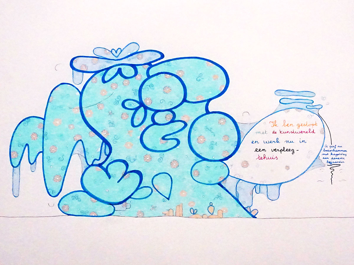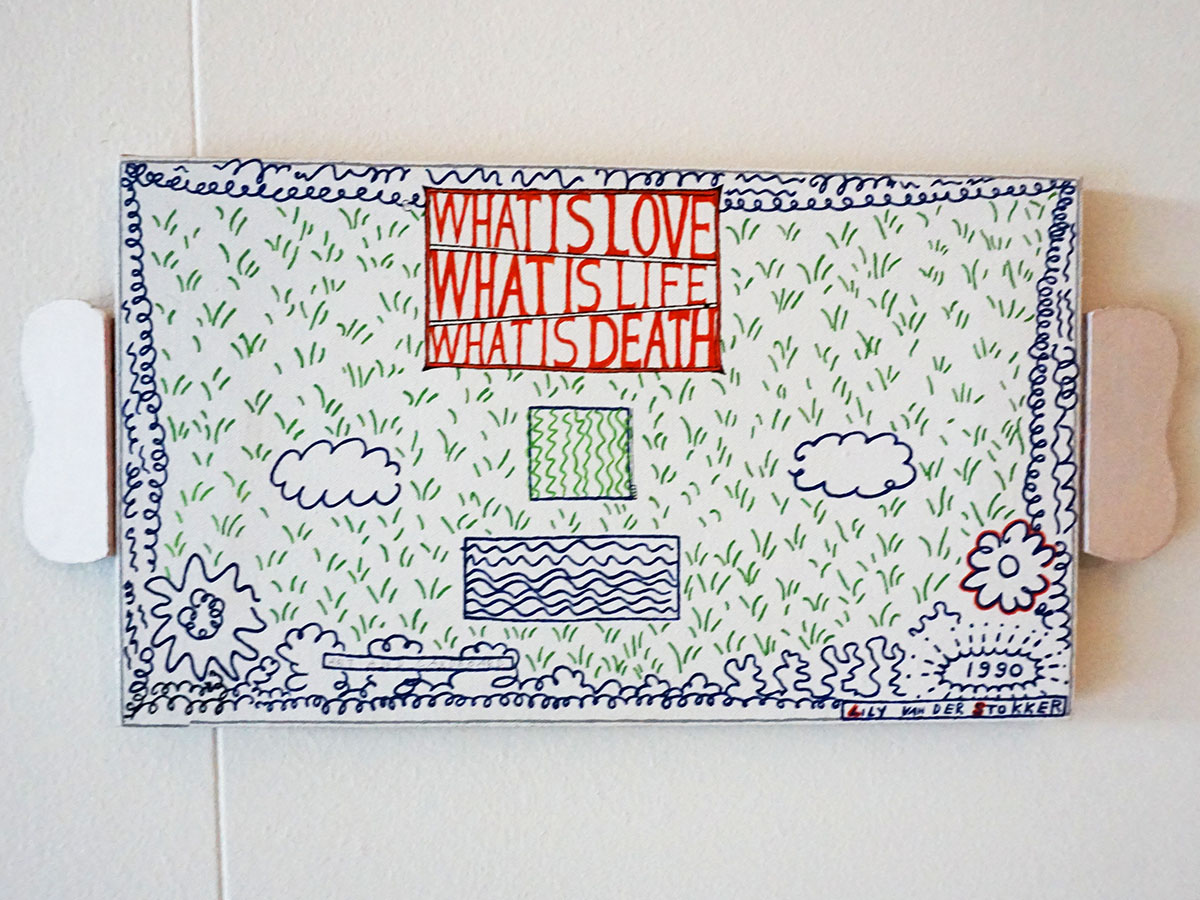 Bovendien wordt je door het lezen van de kleine lettertjes letterlijk met je neus op de feiten gedrukt. Het is precies die wisselwerking tussen het droedelachtige totaalbeeld en de scherpe uitgeschreven detaillering waardoor het werk interessant en tentoonstellingswaardig wordt. Door die noodzakelijke toenadering tot de dieperliggende betekenis van het beeld voer je als kijker steeds opnieuw een klein dansje uit met het werk. In plaats van lamlendig te slenteren langs een verzameling kunstwerken, zoals we dat in (te) grote musea veelal doen, ontstaat er door de aantrekkingskracht van het werk een zich steeds herhalende fysieke beweging van de bezoeker in de tentoonstelling. Dat is hoe het werk werkt. Ik draag Lily van der Stokker dan ook graag voor voor de eerstvolgende prijs voor performancekunst. Of een belangrijke poëzieprijs. Of een architectuurprijs. Als het maar weer een tentoonstelling oplevert.