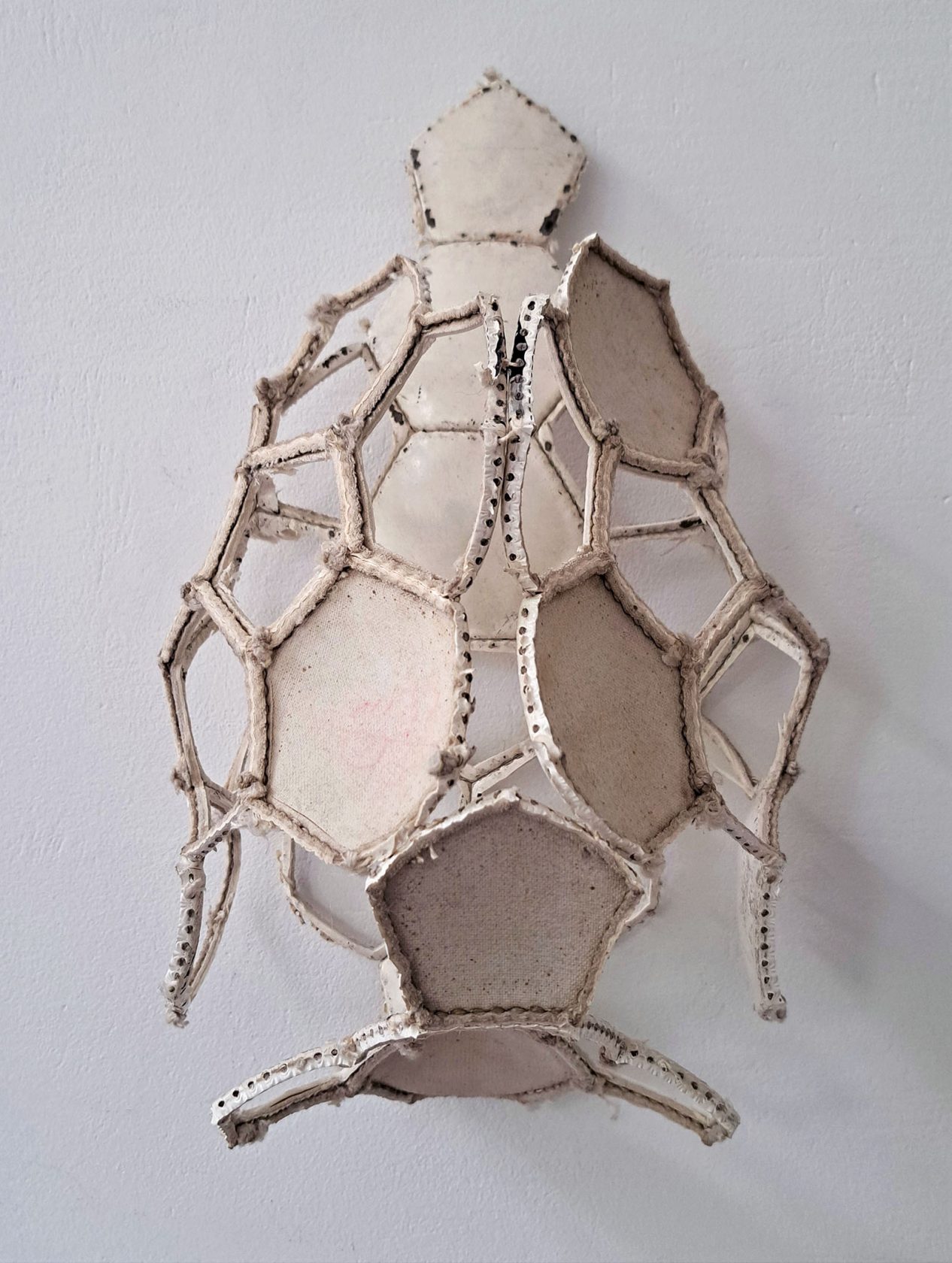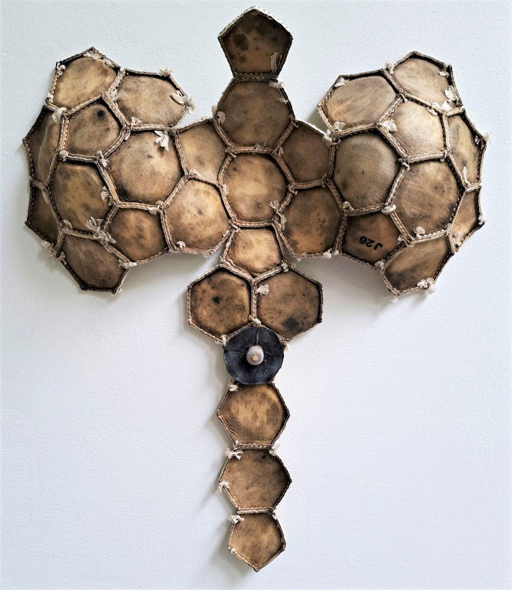 De honingraat en het vijfkant vormen echter wel een beperking voor het samenstellen van een nieuw beeld. Het is een hulpmiddel maar tegelijkertijd ook een belemmering om je in uit te drukken. Het vergt een hoge mate van creativiteit om los te komen uit die beperking. Om de grenzen van het materiaal te zoeken en deze barrières te slechten. Meijer weet het uiterste in de bal te vinden om daar krachtige expressies mee te maken. Die, althans in de expositie bij Kunstlokaal No.8, nergens rijmen en gaan vervelen. Wel komen vormen bekend voor omdat ik aan andere wanden soortgelijke figuren zag met net een andere twist. Maar het blijven originele modellen en de bal is als platte vorm nog lang niet versleten.