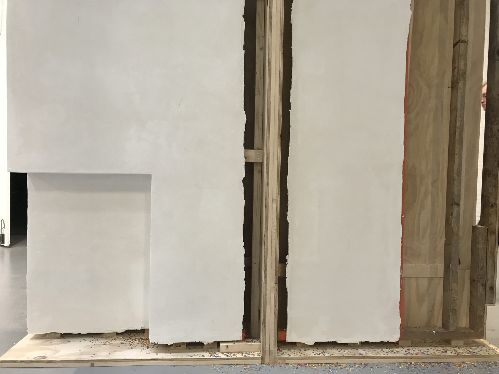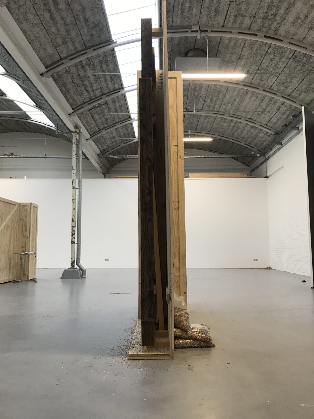 De andere muur in de zaal lijkt niet compleet. Middenin is een balk te zien, en het rechter gedeelte van de wand is niet afgedicht met een gipsplaat zoals de rest van de muur. Zo is het meer een object dan een functionele muur, een autonoom wandsculptuur van hout en gipsen platen, dat vertelt over balans en compositie en constructie en materiaalgebruik. Alles voedt het idee van een theatersetting, een mix als het ware van architectuur en een decor. Aan de ene kant -de voorkant-, toonbaar en representatief voor wat het moet doen, aan de andere kant -de achterkant- een prop, een tijdelijk iets dat zo verscheept kan worden in de kistplaten die al klaar staan.