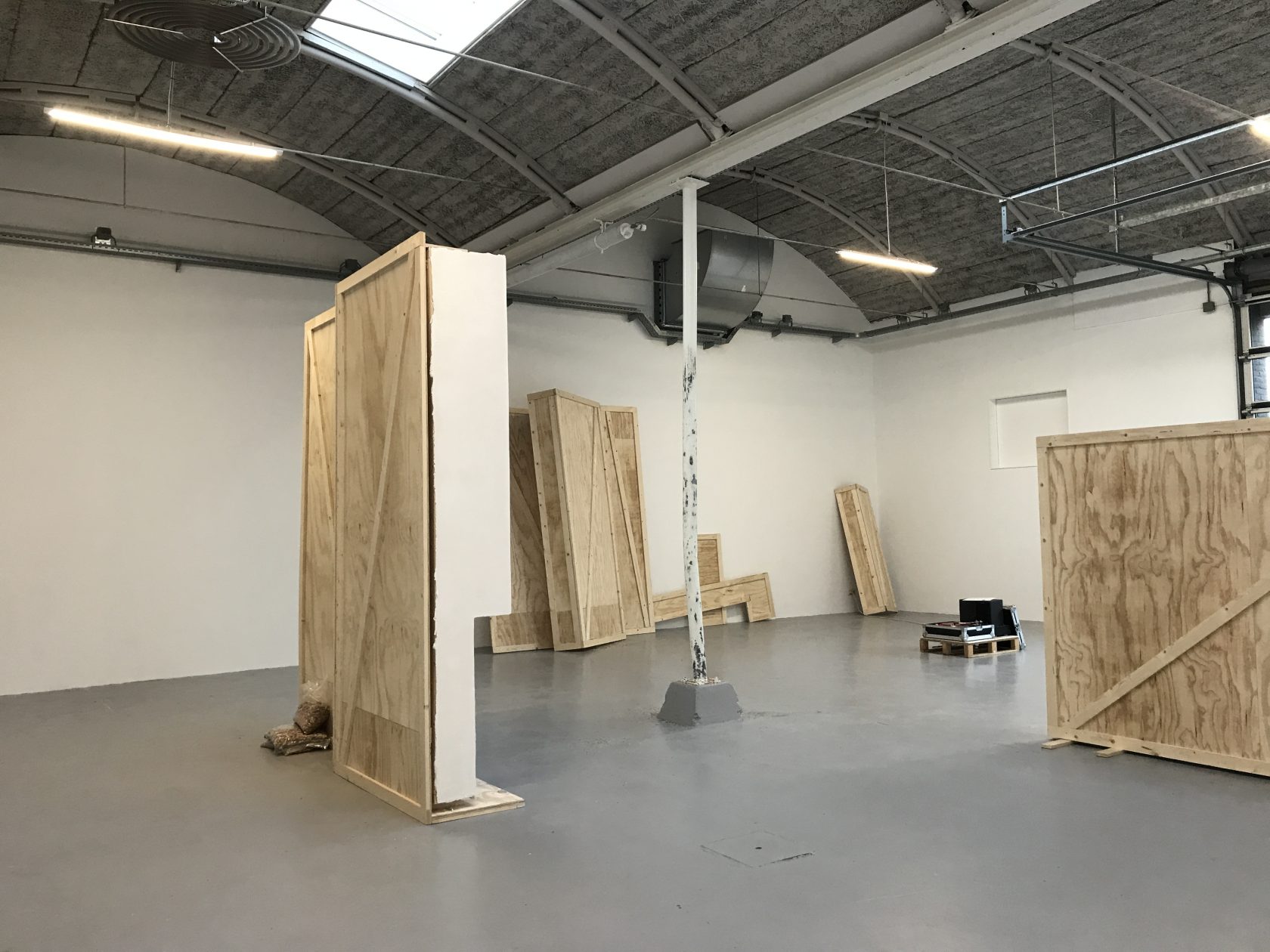 Tegen de muur staan grote houten planken, ze doen me denken aan een transportkist waar kunstwerken in verscheept worden. De kist is uit elkaar gehaald en de losse delen leunen tegen de muur. Maar als ik ze in gedachten aan elkaar zet, zie ik dat ze niet allemaal op en bij elkaar passen. Misschien horen ze deels bij de twee muren midden in de ruimte.