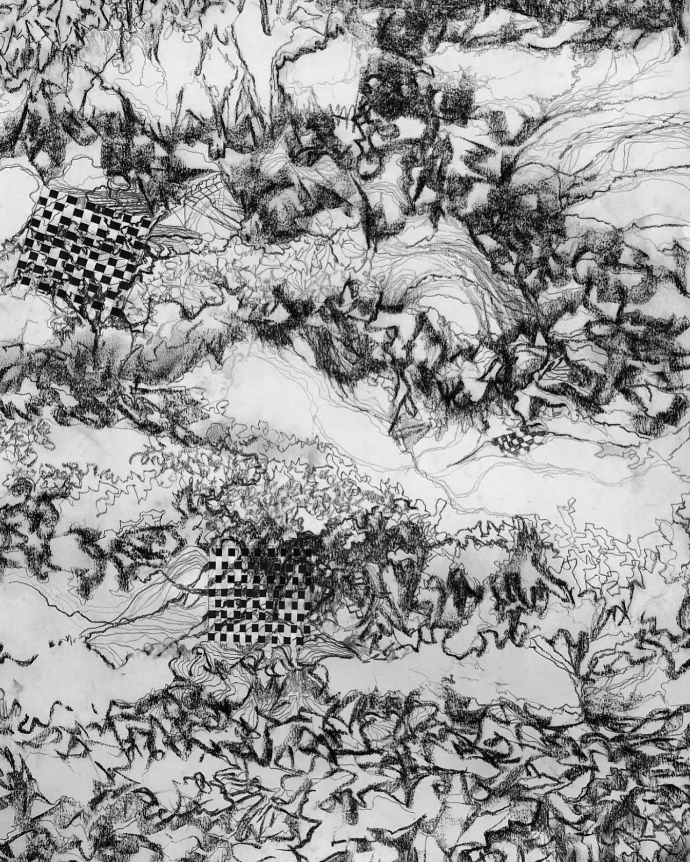 Voor Esther IJssels mag de natuur de bron zijn, ze geeft haar niet letterlijk weer. Haar werk begeeft zich tussen figuratie en abstractie. De beschouwer kan in de tekening een bosrijk landschap zien of er een weelderig grasveld in ontdekken. Maar dat is niet wat IJssels er bewust in heeft getekend. In een speelse opbouw van kriebelende handelingen volgt de hand intuïtief de geest. Toeval speelt er een rol. Bewegingen worden instinctief gemaakt. Ze refereren aan de natuur maar zijn er geen deel van. Ik weet wat ik zie, maar kan het niet thuis brengen in de bestaande wereld. Eigenlijk weet ik helemaal niet wat ik zie of waar ik naar kijk. De compositie heeft wel een herkenbaar kader, een verwijzing naar de omgeving. De krabbels, het kriebelende handschrift prikkelt, het jeukt aan het landschap. Maar het zijn niet de hoogtelijnen van de landkaart. Het is niet het bos en het zijn niet de bomen. Het is niet het wuivend riet of de golven van water. Het is niet de zichtbare realiteit. Juist dat maakt de compositie zo interessant. Er is herkenning, maar geen identificatie. Opdat ik mijn eigen emotie aan de gevoeligheid van Esther IJssels kan koppelen. In haar tekenwerk gebruikt IJssels het effect van licht dat schaduwen vormt. Ook verwerkt zij zogenoemde weefplekken in het werk, dat contrasteert met de belijning in de gehele compositie. Het is voor de kunstenaar een spannende ingreep. Zij snijdt in haar werk – maakt het kapot om het vervolgens te herstellen. Als een genaaide lap op het slijtgat in mijn broek.