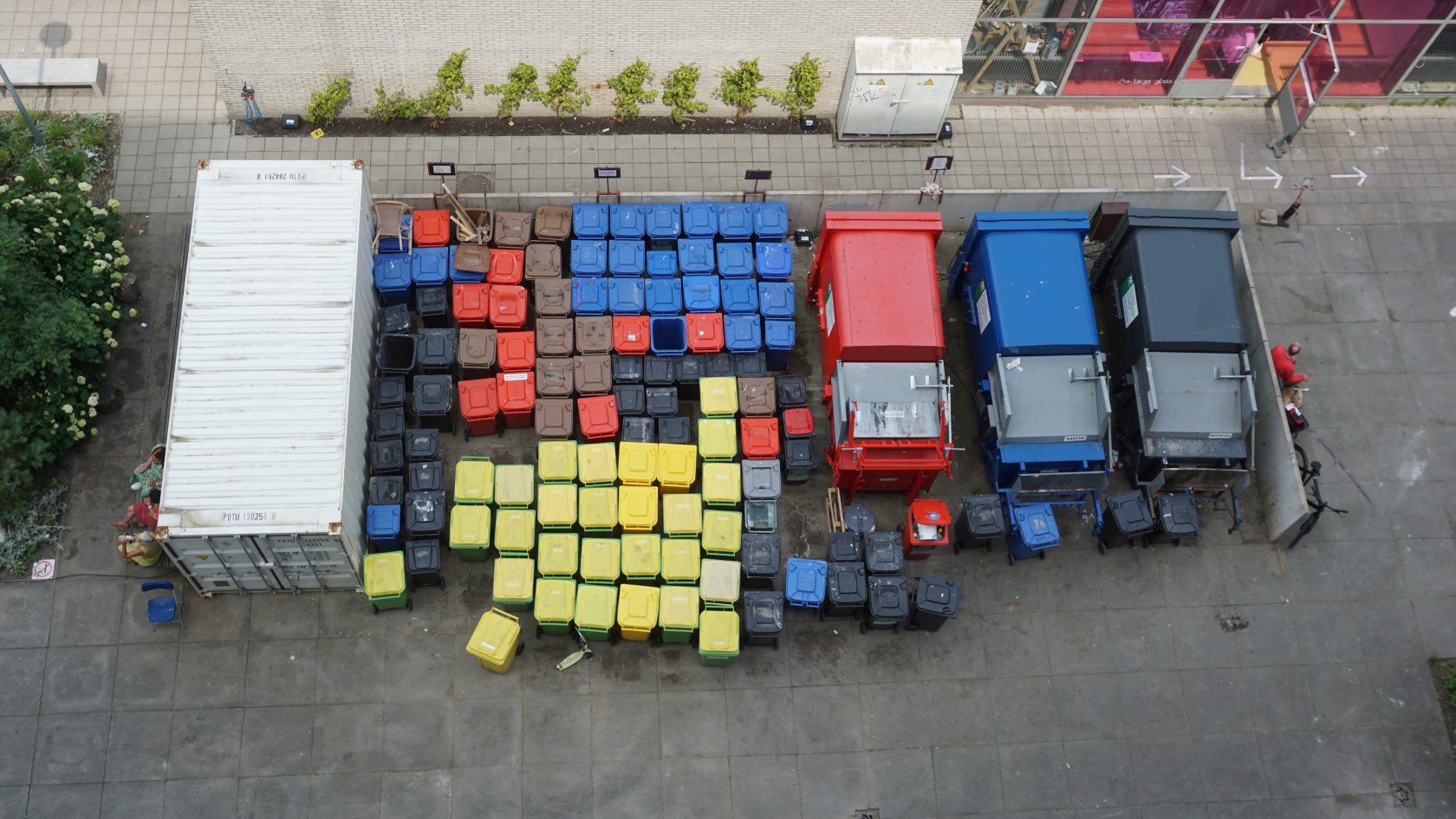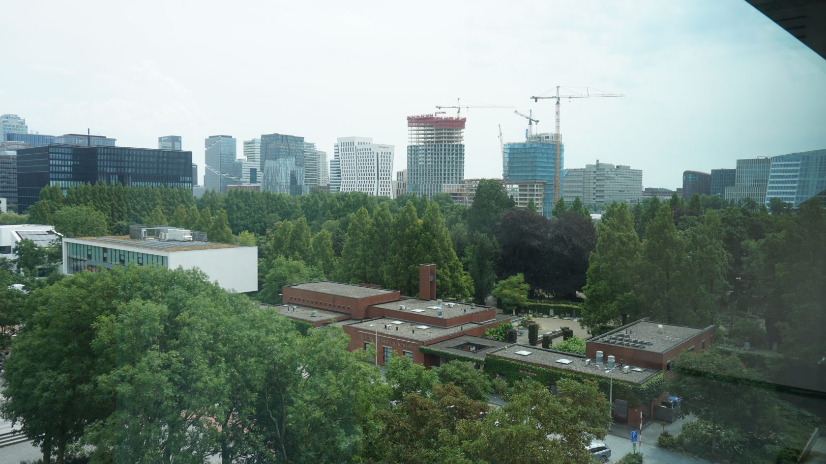 Tot slot sluiten we graag af met het uitzicht vanaf de 7e verdieping van het gebouw. Behalve zicht op het hoofdgebouw biedt het een interessant perspectief op de kleurrijke collectie academische afvalbakken, de snel oprukkende Zuidas, en het optreden van een familiefeestje in het parkje naast de academie.