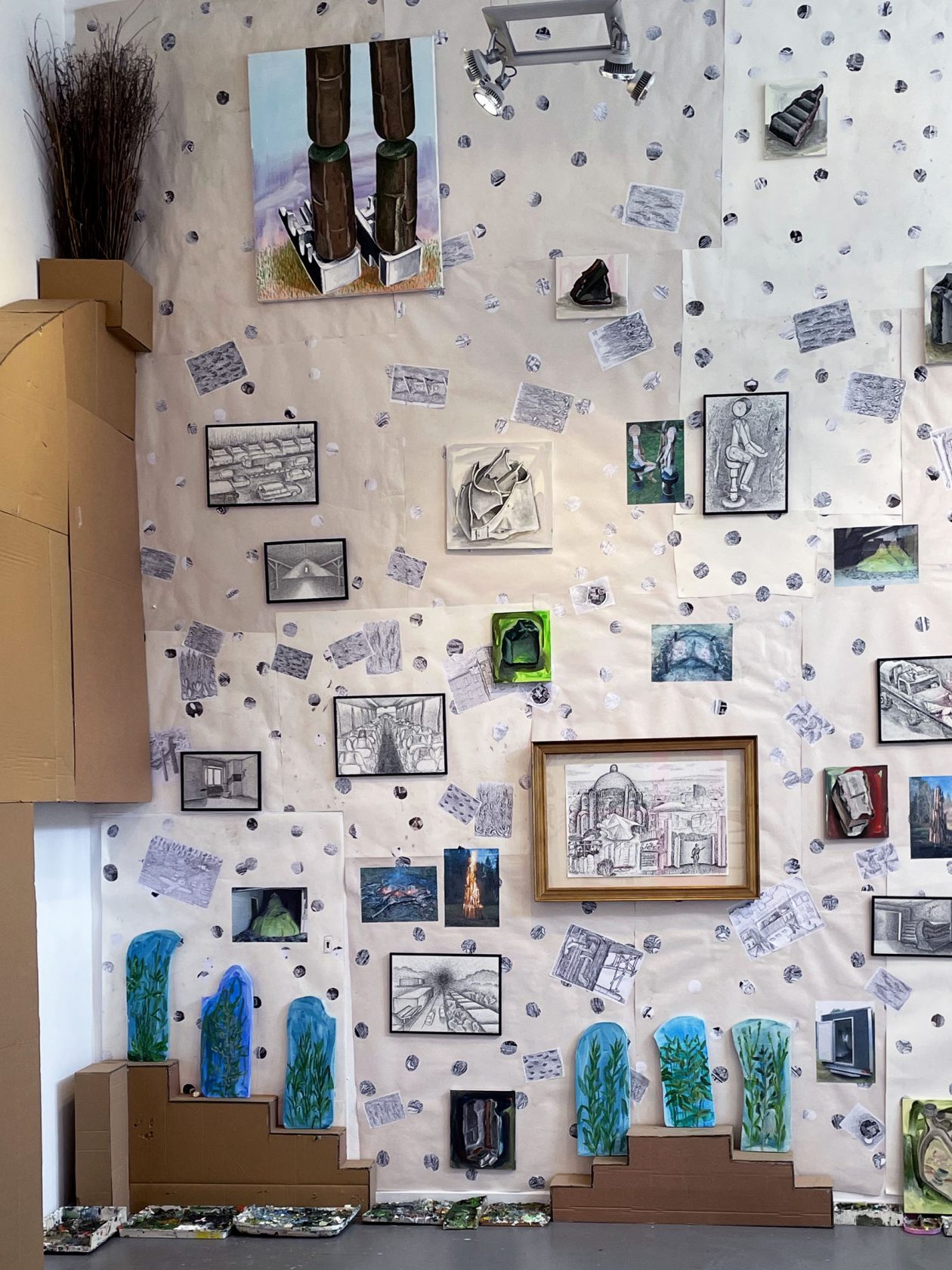 Urs Pfannenmüller (Bazel, 1943) is ook zo’n ‘bouwende’ dromer. Hij bouwt rustig, in Den Haag al vanaf 1968 tot nu, voort aan zijn artistieke universum, dat bestaat uit schilderijen, tekeningen of objecten, waarmee hele wanden gevuld worden, of objecten (bouwsels), waarmee soms hele ruimtes getransformeerd worden. Iedere keer opnieuw verschijnt een nieuwe variant. Dit keer wordt je, in de Haagse Kunstkring, binnen geleidt door een, aan de linker- en rechter zijkanten van de muur, smalle bordkartonnen architectuur, en stap je in een wereld die een demonstratie is van een betekenisvolle, maar nog niet ‘beschreven’ realiteit, waar de hiërarchie tussen de getoonde beelden nog vorm moet krijgen, waar de ene uitdrukkingsvorm niet onderdoet voor de andere, maar samen een nieuwe samenhang vormt. Eén van zijn pentekeningen toont de stad Liège (Luik) in gecomprimeerde vorm, waarbij vazen langzamerhand transformeren in klassieke hoogbouw, en vice versa. Een stad die weliswaar plat getekend is, maar je doet dwalen door fascinerende gebouwen, kathedralen, straten en pleinen, boordevol oude en nieuwe verhalen. Een poging om nieuwe categorieën te vinden voor de vormgeving van onze steden. Het doet me denken aan de poëtica van de Amerikaanse postmoderne architect John Hejduk (1929-2000), ook hij probeerde in zijn beeldende werk, en gedichten, nieuwe formuleringen (vormen) te vinden voor wat je ook ‘gebouwen’ zou kunnen noemen. In de stad Groningen kun je zijn Wall House 2, één van den paar werkelijk gebouwde zéér opmerkelijke ‘huizen’ van John Hejduk bewonderen.