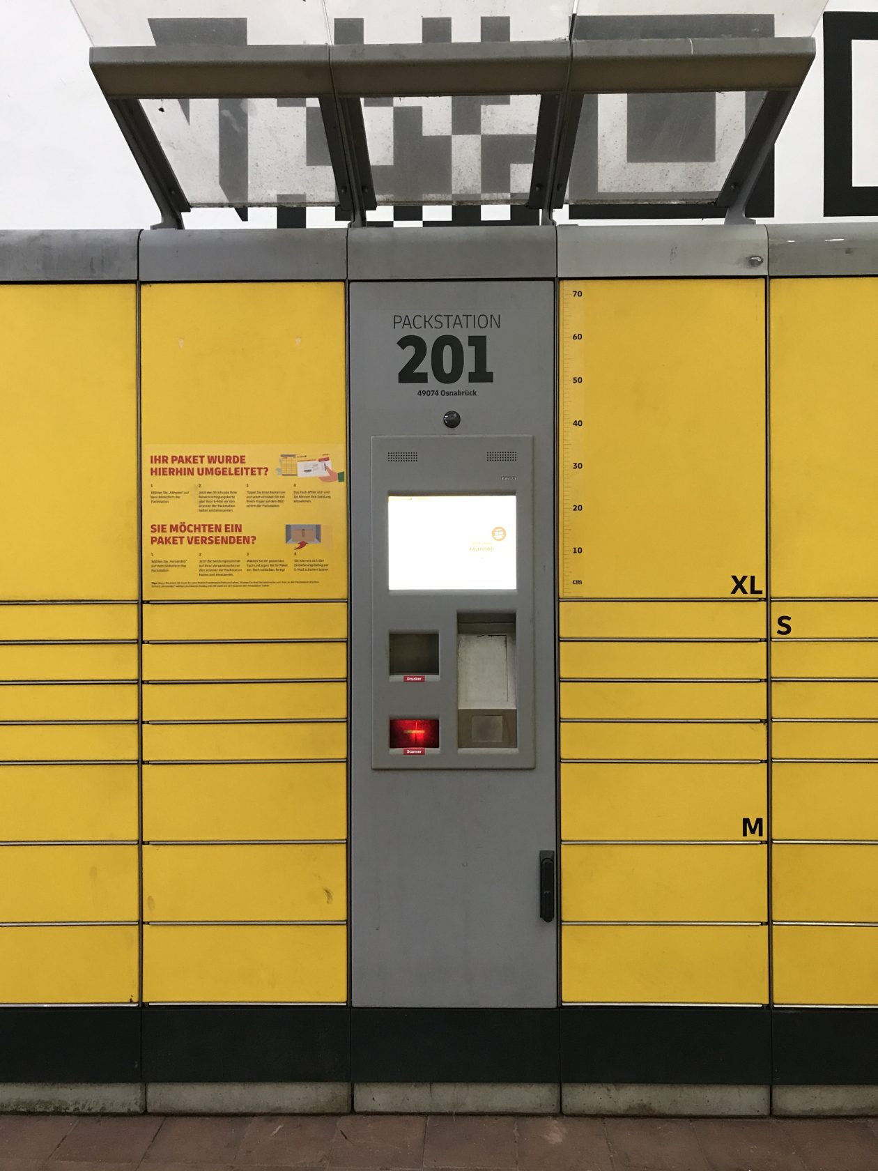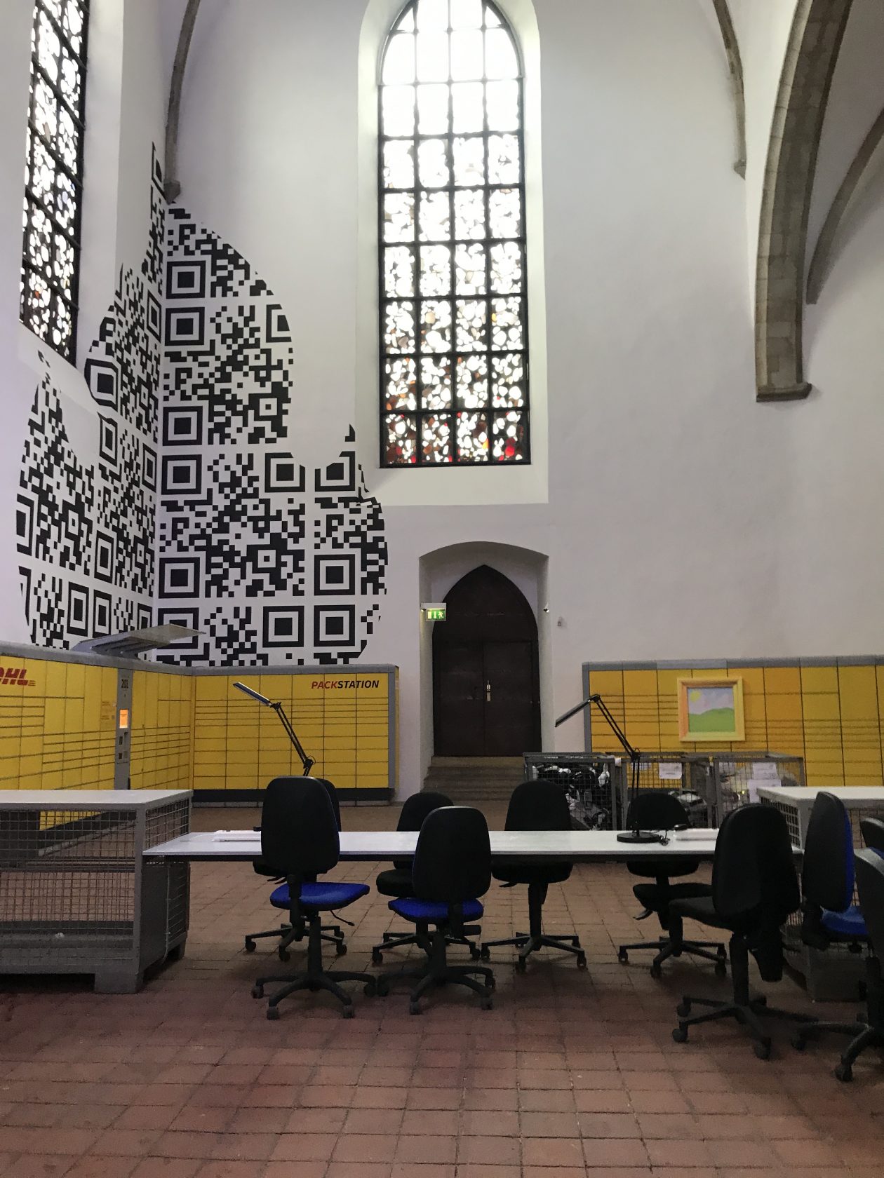 In de Kunsthalle Osnabrück kan je sinds afgelopen juli je DHL pakketje wegbrengen en ophalen. Bij binnenkomst is de hoek met de grote gele DHL pakketautomaat en selfservice loket niet te missen maar toch komt de twijfel direct op. Klopt dit, is dit wel een officieel pakketpunt of ben ik nu zomaar onderdeel geworden van een performance in een kunstinstallatie? Naast de lockers staan bureaus aan elkaar in een u-vorm met ertussenin manden met kapotte dvd spelers en ander digitaal afval, er staan bureaustoelen om heen en op de muur is een enorm grote QR-code opgeplakt.