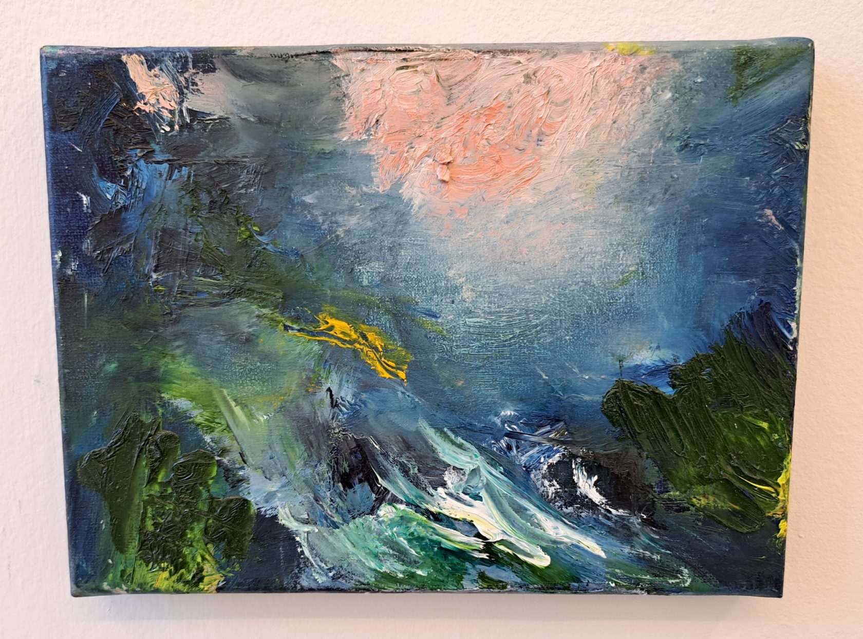 “In tijden van overweldigende emoties van vergankelijkheid en verlies, maar ook van uitzinnige vreugde, kan het beleven van het landschap en het ervaren van de natuur helpen bij het reflecteren op deze vragen en tot rust en stilte te komen.” Met deze volzin duiden de kunstenaars wat de betekenis van hun werk kan zijn. In H47 ervaar ik het laatste deel van de zin. Vooral in en door de installatie van Hilde Huisman kom ik tot rust na de drukte van de antiekmarkt op het Zaailand achter me gelaten te hebben. De stilte vind ik in het kleurenpalet van Wia Bouma. Het is een bijzondere ervaring deze kleine maar fijne tentoonstellingsruimte te bezoeken. Gesitueerd in het voormalige oude mannenhuis aan de Haniasteeg. In vroeger tijden een thuis voor bejaarde mannen. Nu een thuisbasis voor de hedendaagse beeldende kunst in het noorden van Nederland. Een serene kunstoase in de jachtige atmosfeer van de stad.