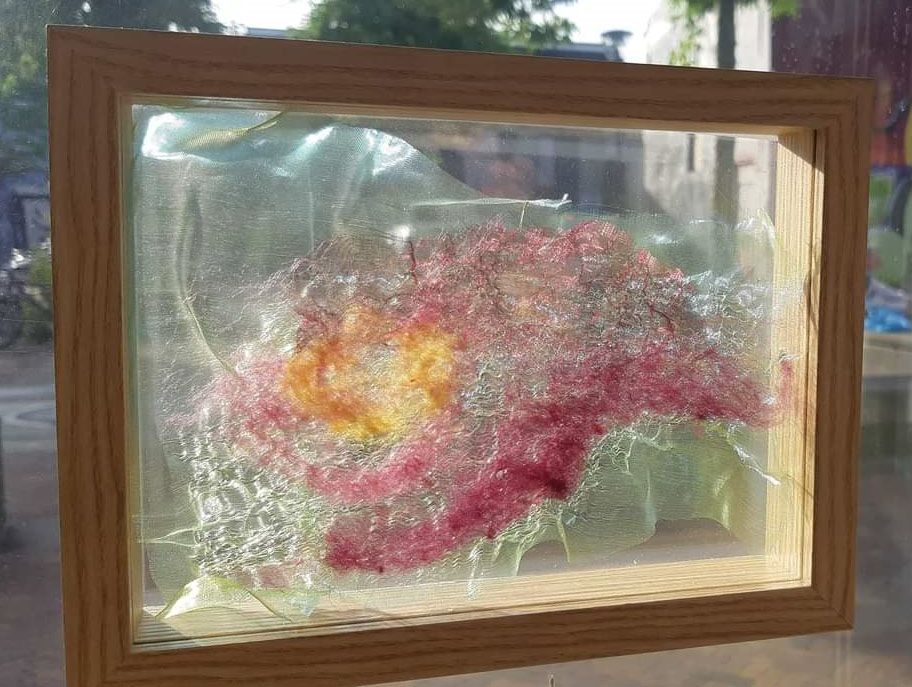 In de kozijnen voor de glasramen heeft Huisman kleine ingelijste werken laten hangen. Deze zijn doorzichtig en zowel van buiten als van binnen te bekijken. De tweezijdige composities zijn landschappelijke impressies gebruik makend van licht en schaduw. Vertalingen in de stoffen organza en wol. Beide uitvoeringen geven beeld aan de idee van de kunstenaar. Is Bouma compact en luisterrijk, Huisman is in haar werk transparant en fragiel.