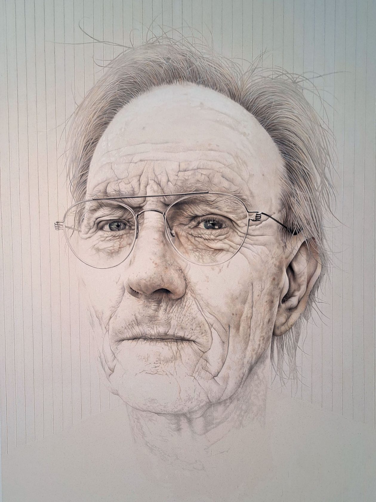 Om in het beeld nog meer op avontuur te kunnen gaan, is een dimensie aan het werk toegevoegd. De drager waarop de kop staat getekend is uitgesneden en bevestigd op een nieuwe ondergrond. Zo ontstaat letterlijk diepte in de tekening. Ook nog eens versterkt door toevoeging van geborduurde details. Het betreft niet enkel een creatie met potlood en penseel op linnen, er zijn onderdelen in een andere stof toegevoegd. Zo is een blouse afgezet met vlokken kleur en werd een bril in jute op de beeltenis geplakt. Het geeft een bijzonder effect. Het werkt de optische diepte in de hand.