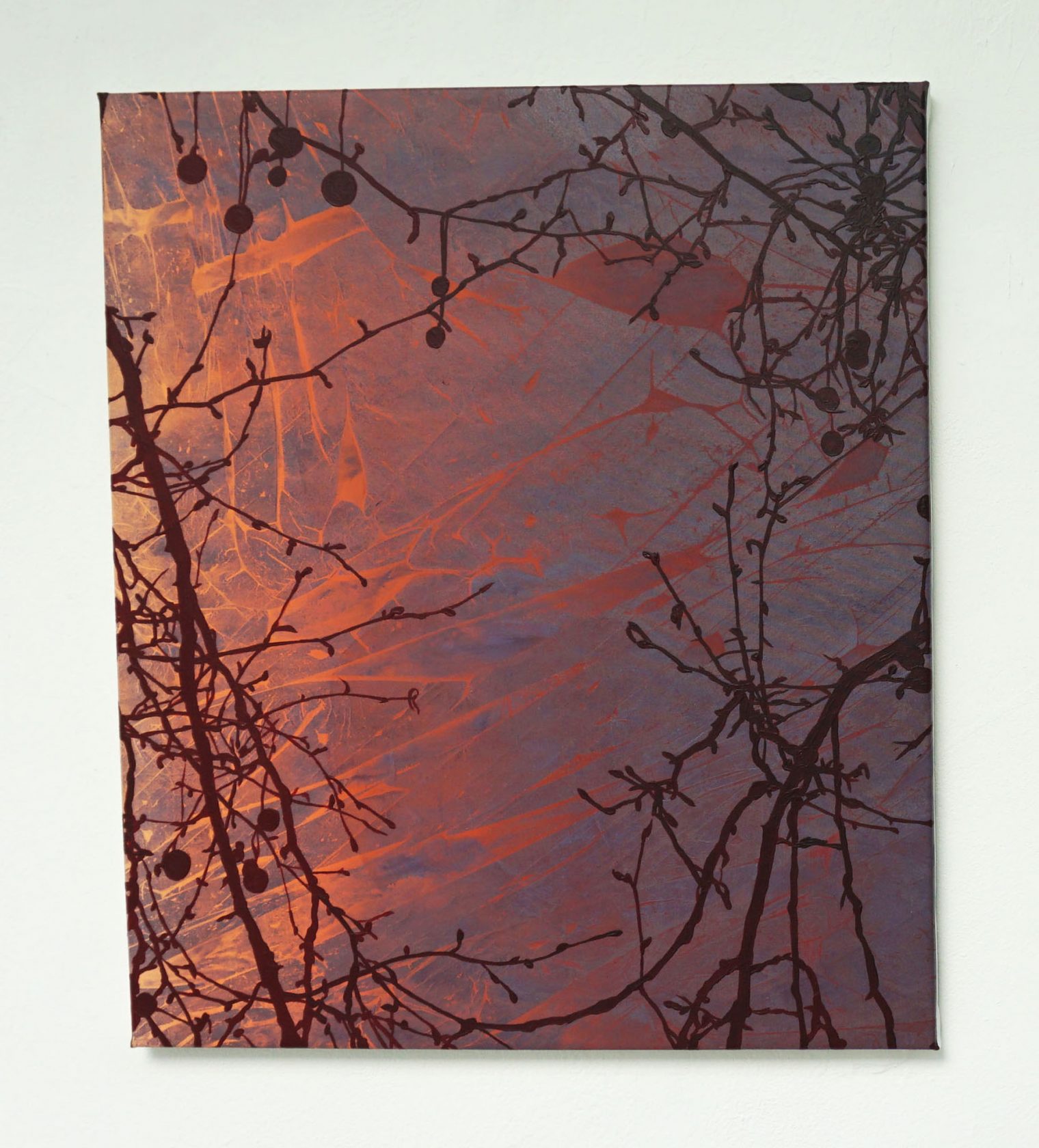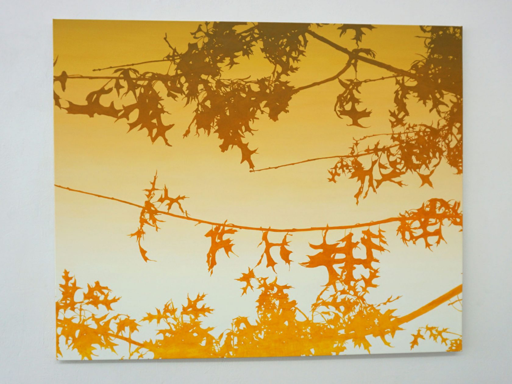 Vortex heet de presentatie van Tycho van Zomeren (1986) die bestaat uit een serie schilderijen die op zichzelf net zo ‘crisp’ zijn als ze zijn opgehangen. Tegen een achtergrond van een strak kleurverloop zien we een bijna willekeurige structuur van takken die zich organisch een weg banen door het universum. Even krijg ik de indruk dat het dakramen zijn die zicht bieden op de oneindigheid van de kosmos, maar de schilderijen bestaan feitelijk uit slechts twee lagen. Dichtbij en onmeetbaar ver weg. De kleurstelling, het formaat, de compositie en de toegepaste abstractie verraden een groot gevoel voor harmonie en esthetiek.