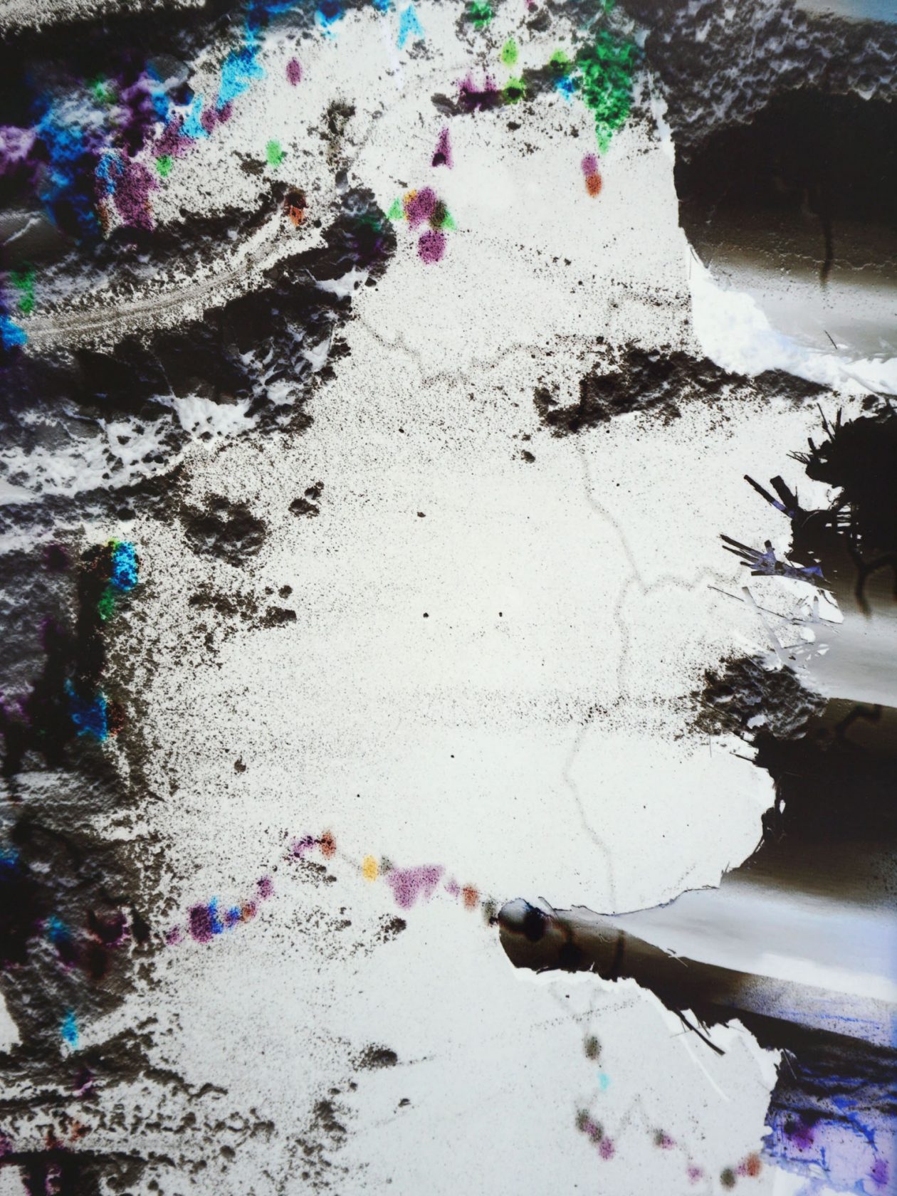 Ook in deze presentatie wordt ik aangetrokken om alles van dichterbij te kijken, maar niet vanuit mijn behoefte naar ‘meer’. Maar uit nieuwsgierigheid die het werk zelf weet op te wekken. Het beeld heeft zodanig veel bewerkingen ondergaan dat handeling en resultaat niet meer uit elkaar te halen zijn. Ik laat me vertellen dat de handelingen allemaal analoog zijn uitgevoerd, maar het resultaat maakt een bijna digitale reproductieve indruk.