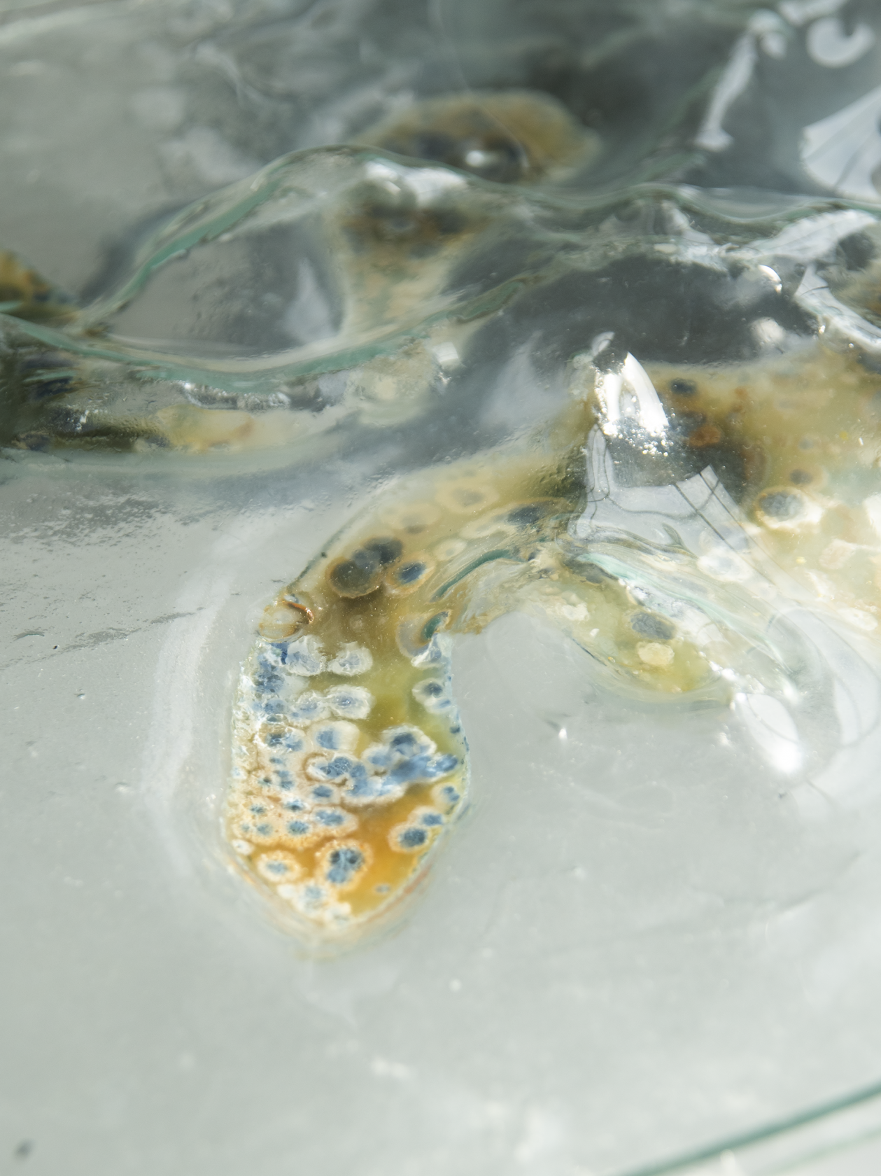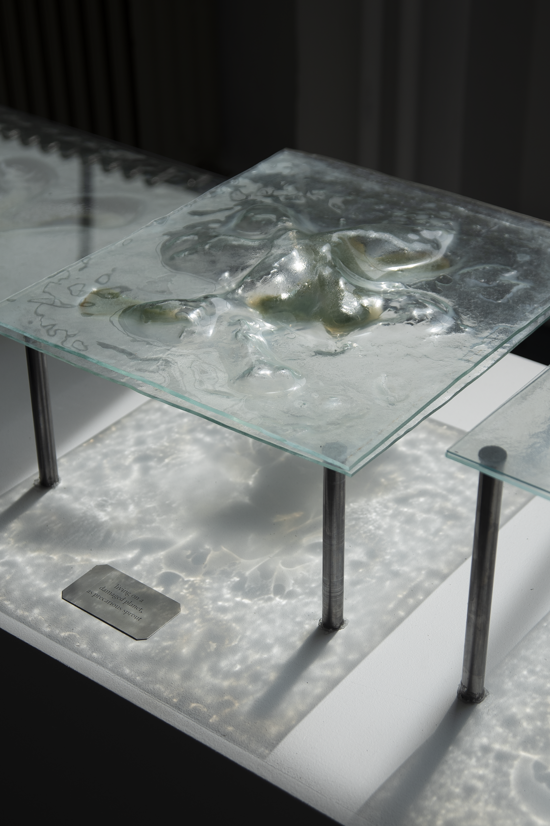 I had the idea glass could be interesting to work with, as it is fragile and see-through. I discovered this greenhouse glass I thought was very conceptually fitting material and I decided to use it. Glass is – just like the organisms – a vulnerable, fragile and uncontrollable material. The organisms might not work or cultivate or just die, and then the glass could break… I had a lot of stress while working with these fragile and alive materials, given their uncontrollable and vulnerable nature.