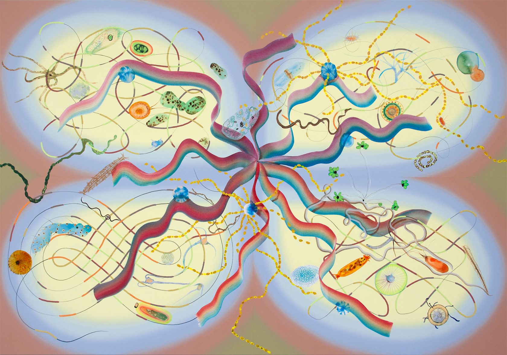 Happily, painting is uniquely suited to both interpret and be, since it is all but screaming its simultaneous affectation and sincerity in a single, impassioned, anthropocentric refrain. Each painting in Myriad Ways of Being ~ Being of Myriad Ways reads as a visual Latour litany of microscopic matter outside of human construct, as viewed through the shadows of Plato’s cave. Yes, and.