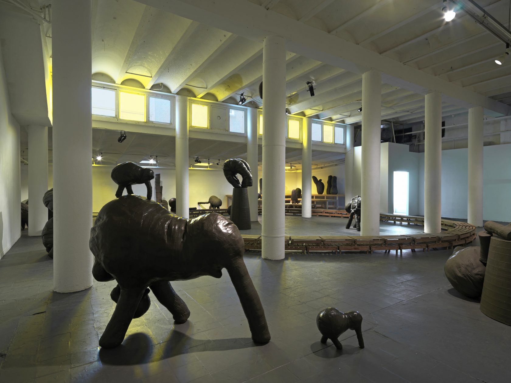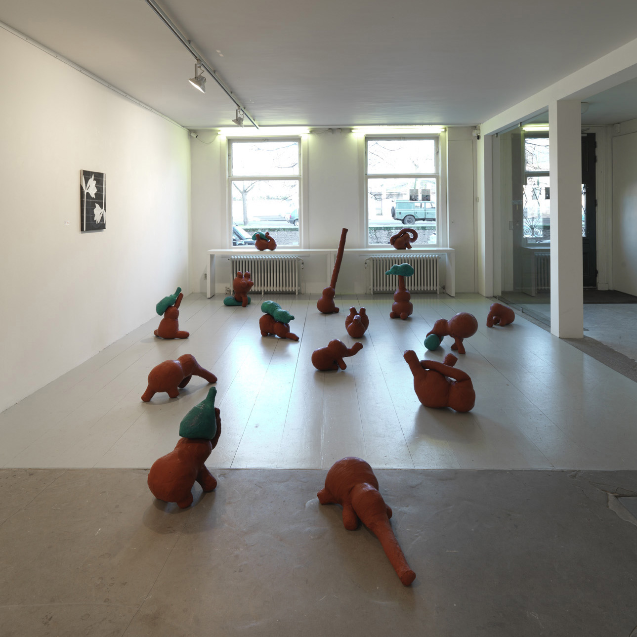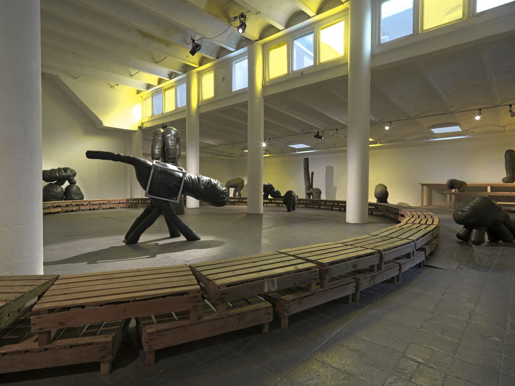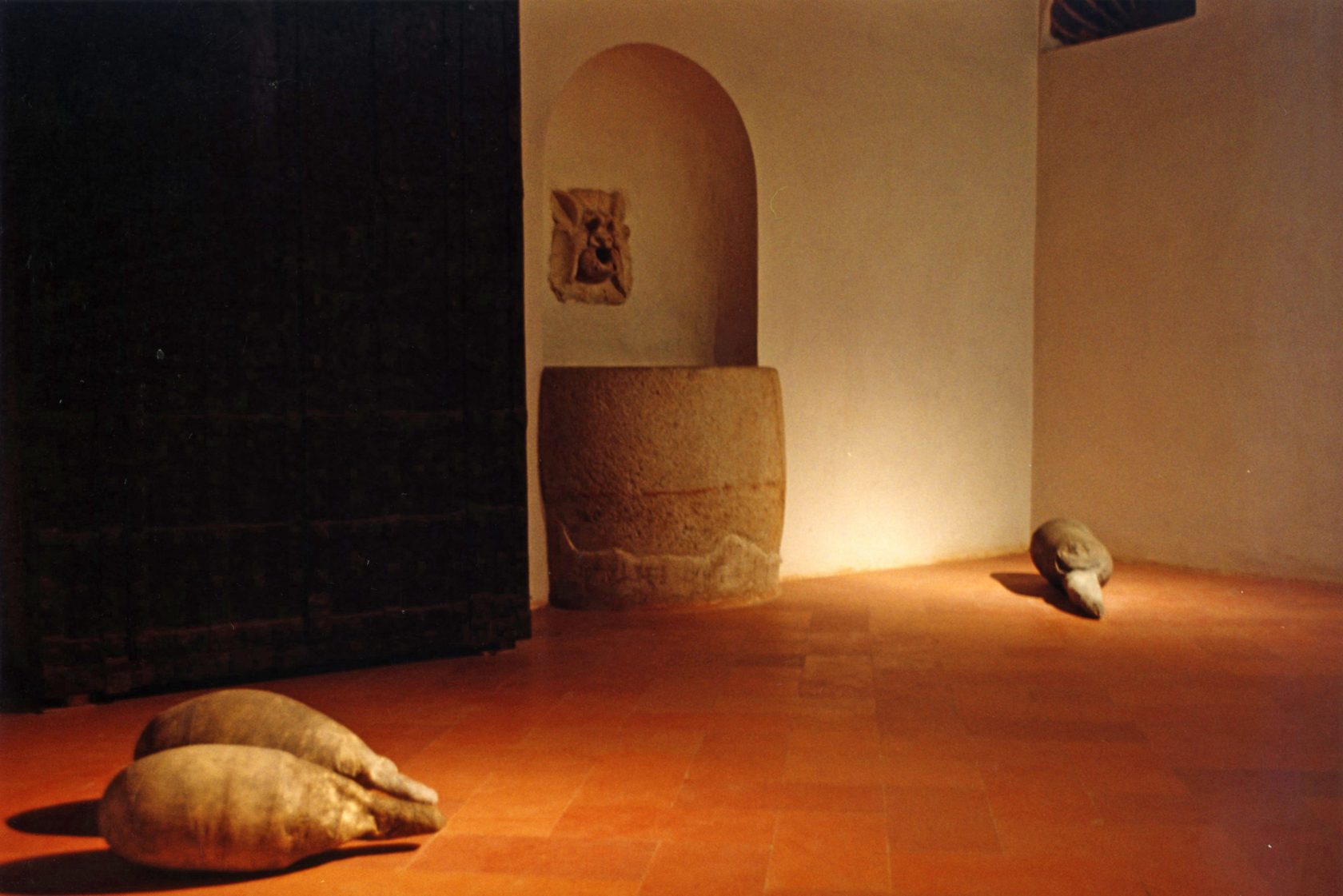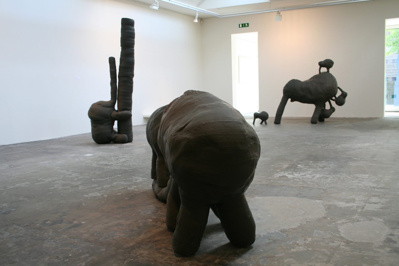 Ik tref in de catalogus van deze tentoonstelling ‘Indizi Terrestri’ (1995) vier werken aan uit de eerste helft van de negentiger jaren. Vier sculpturen, die zich niet gemakkelijk laten duiden, maar ze suggereren alle vier een ‘aanwezigheid’ in het grote rijk van organische vormen. Bij de sculptuur ‘Loos’ (1993) hangt een langgerekte rubberen vorm dubbel geklapt aan een touwtje, en doet mij sterk aan sommige hangende sculpturen van Eva Hesse (1936-1970), de Duits-Amerikaanse minimal beeldhouwer, wiens sculpturen een mens zo diep emotioneel kunnen raken en ontroeren. Het beeld ‘zonder titel’ (1994) ‘zit’ op de grond, twee dunne vormen (benen) voor zich uitstrekkend. Beweegt het zich voorwaarts? Of rust het uit, na een lange reis? Haar ronde vorm, die op een aardbol lijkt, is samengesteld uit stukken rubber. Haar huid lijkt een lange geschiedenis te hebben en daar aandacht voor te vragen, zij wil ‘bestudeerd’ worden. Is zij wellicht een beeld uit oude tijden, gearriveerd in nieuwe tijden. Of lijken de ‘nieuwe’ tijden veel op de ‘oude’? Ook de wormvormige sculptuur met de drie ‘spenen’ heeft een rimpelige huid, vol lijnen. Zijn het littekens, zijn het tekens van tijd, welke tijd dan ook? Zij ligt op haar zij, en wacht rustig af. Eén wezen ligt met zijn achterkant bijna tegen de plint van de muur aan, zijn uitsteeksel steekt naar voren, de ruimte in. Rust die uit? Of, is hij de ruimte aan het verkennen? Om die te veroveren, wellicht? De huid kan eveneens van oude als van jonge tijden zijn, net als de andere drie. Of is de huid van alle vier niets anders dan uitdrukking van hun materiaal, namelijk rubber. Wil het vorm krijgen dan moet je er lucht in blazen. Zonder lucht geen leven.