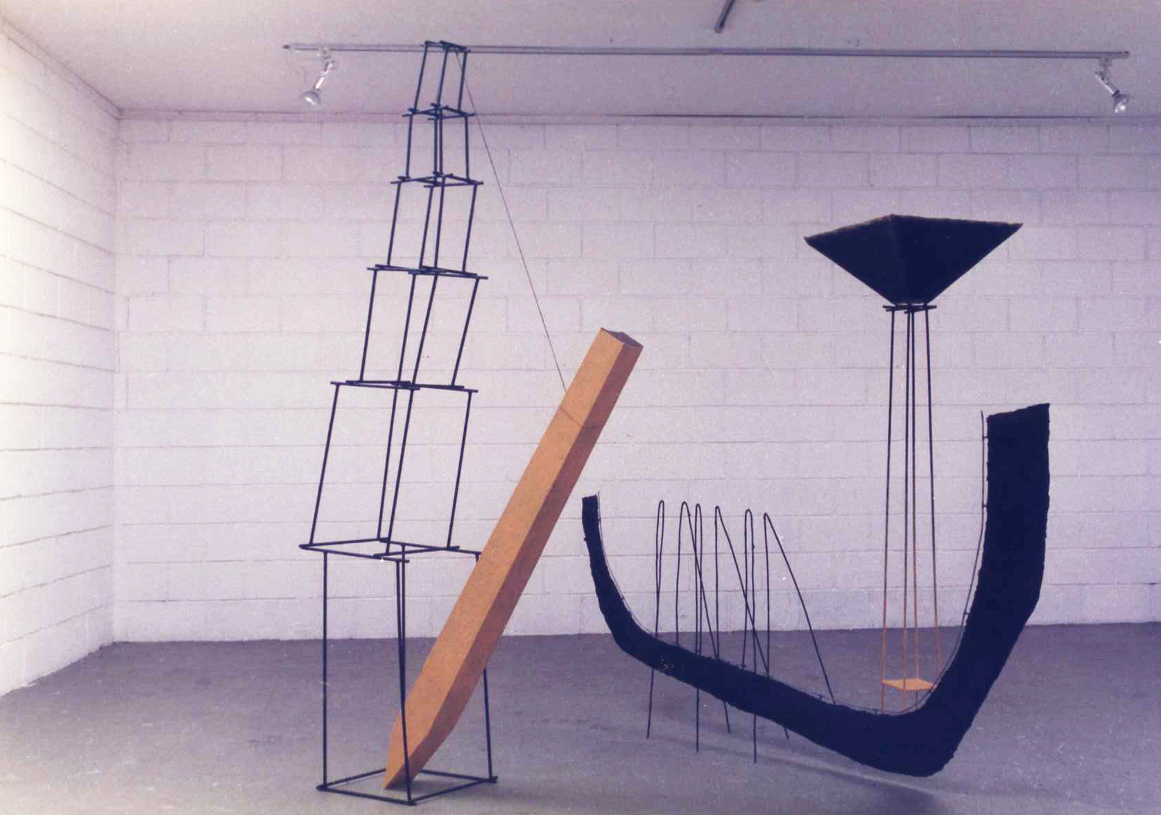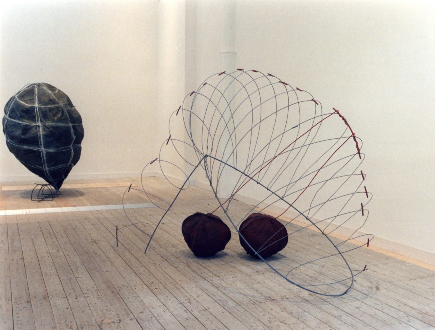 Een contour van een Vikingschip verschijnt, het doorklieft een rij ijzeren staketsels, die de houten bootvorm in balans houden. In een andere sculptuur zie we zes open rechthoeken van staaldraad, die zich ‘dansend’ opstapelen, naar boven toe kleiner wordend, die een lange diagonaal geplaatste houten balk, die halverwege de derde kolom eindigt, dragen. Samen zorgen zij voor een fragiele balans. Vijf, zwaar uitziende, peervormige objecten, waaruit lange ‘haren’ van staaldraad steken, die aan de bovenkanten door ijzerdraad verbonden zijn, vormen een geheel dat zowel krachtig als kwetsbaar is. Of, een grote lichaamshoge rechthoek heeft, als linkerkant een hoge bos fijn ijzerdraad. Het geheel staat ‘open’, fragiel, maar toch stevig op de grond.