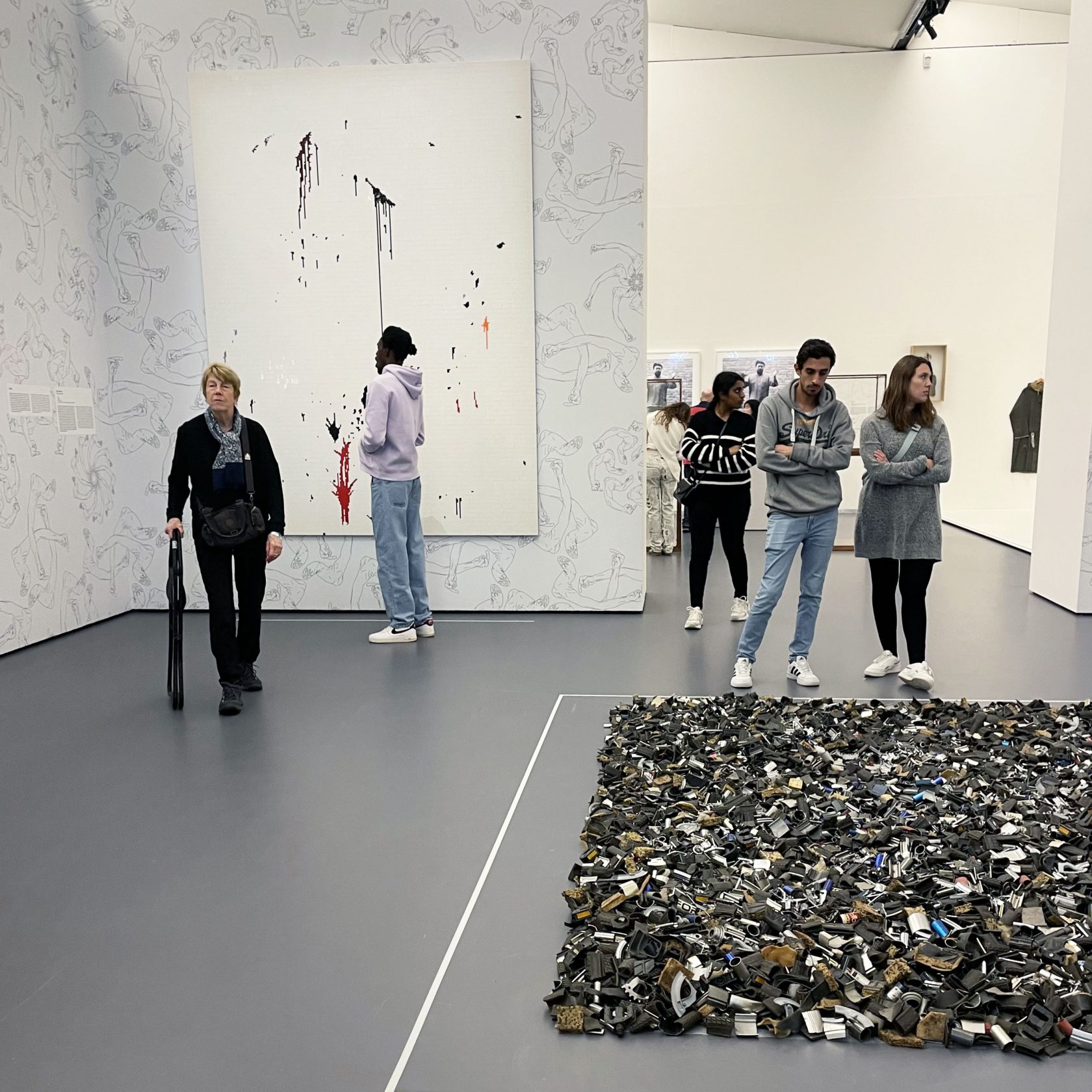 Ik verheugde me op het werk met de duizend kilo met de hand beschilderde porseleinen zonnebloempitten, die vind ik op een hoopgevende, poëtische manier mooi, ik herinner me beelden van mensen die door de zaden lopen, spelen, lachen en de zaden in hun geopende handen door hun vingers laten glijden. Er zijn foto’s waarop de kunstenaar zijn middelvinger voor de lens houdt naar beroemde monumenten, zoals de Eiffeltoren; Study of Perspective, staat erbij. Het ruikt naar fietsenwinkel, vanwege de in stukken gesneden binnenbanden en brokstukken in een strak veld op de vloer.