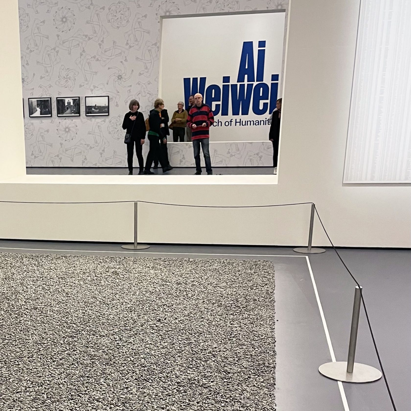 Beneden zoek ik met nog trillende benen het kunstwerk met de zonnebloempitten, ik was eraan voorbij gelopen. De pitten liggen in een strak rechthoekig veld, een grijs tapijt op de grijze vloer, de witte lijn om het vlak valt meer op, daaromheen een laag hekje. Het is duidelijk dat het niet de bedoeling is de pitten aan te raken. Alle speelsheid die ik me herinner is eruit verdwenen, het ligt er doods bij, gewoon als zaden die nooit zullen ontkiemen. Later lees ik dat het stof dat vrijkomt als het porselein wordt stukgelopen de reden is om dat niet meer toe te laten, het stof is slecht voor de luchtwegen. Jammer dat ik er zelfs nooit ook maar aan gedacht heb een pitje mee te nemen. Hier gaat dat niet lukken, een bewaker houdt het publiek in de gaten dat naar de kunstwerken kijkt.